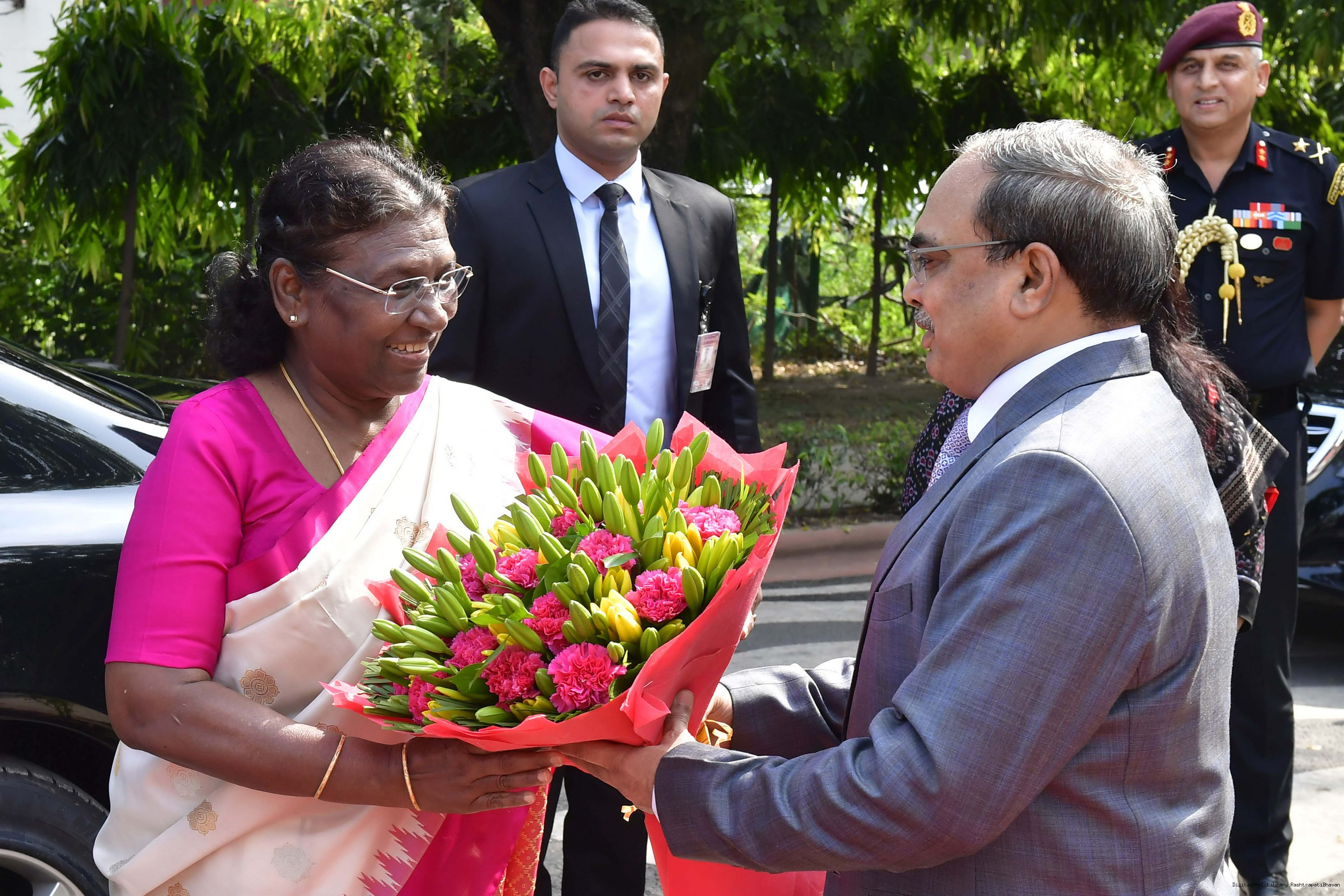 The Vice President of India, Shri Jagdeep Dhankhar greeting the President of India, Smt. Droupadi Murmu, on her birthday, at Rashtrapati Bhavan on June 20, 2023
