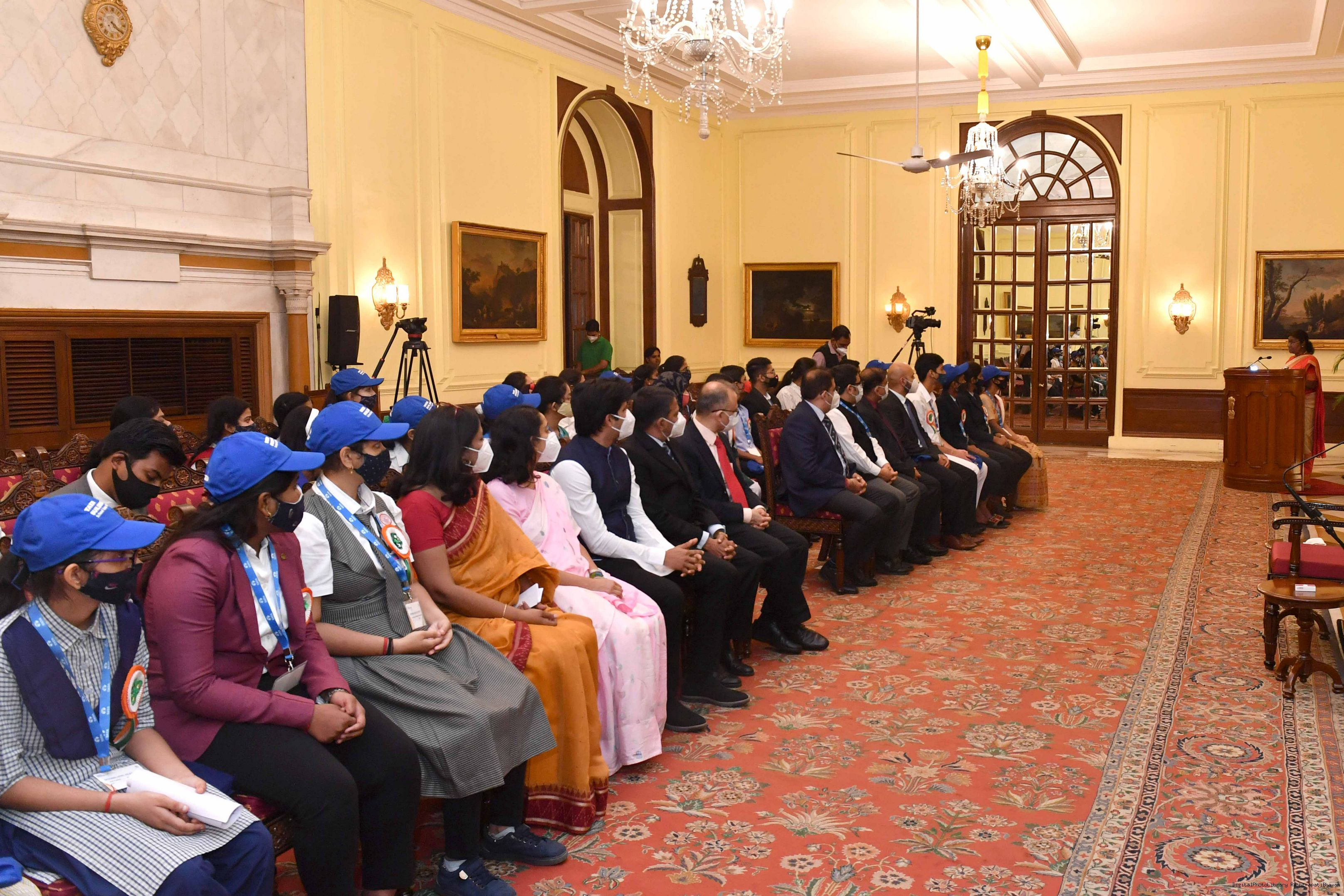 The Winners of the Tata Building India School Essay Competition 2019-20, called on the President of India, Smt Droupadi Murmu at Rashtrapati Bhavan on April 17, 2023.