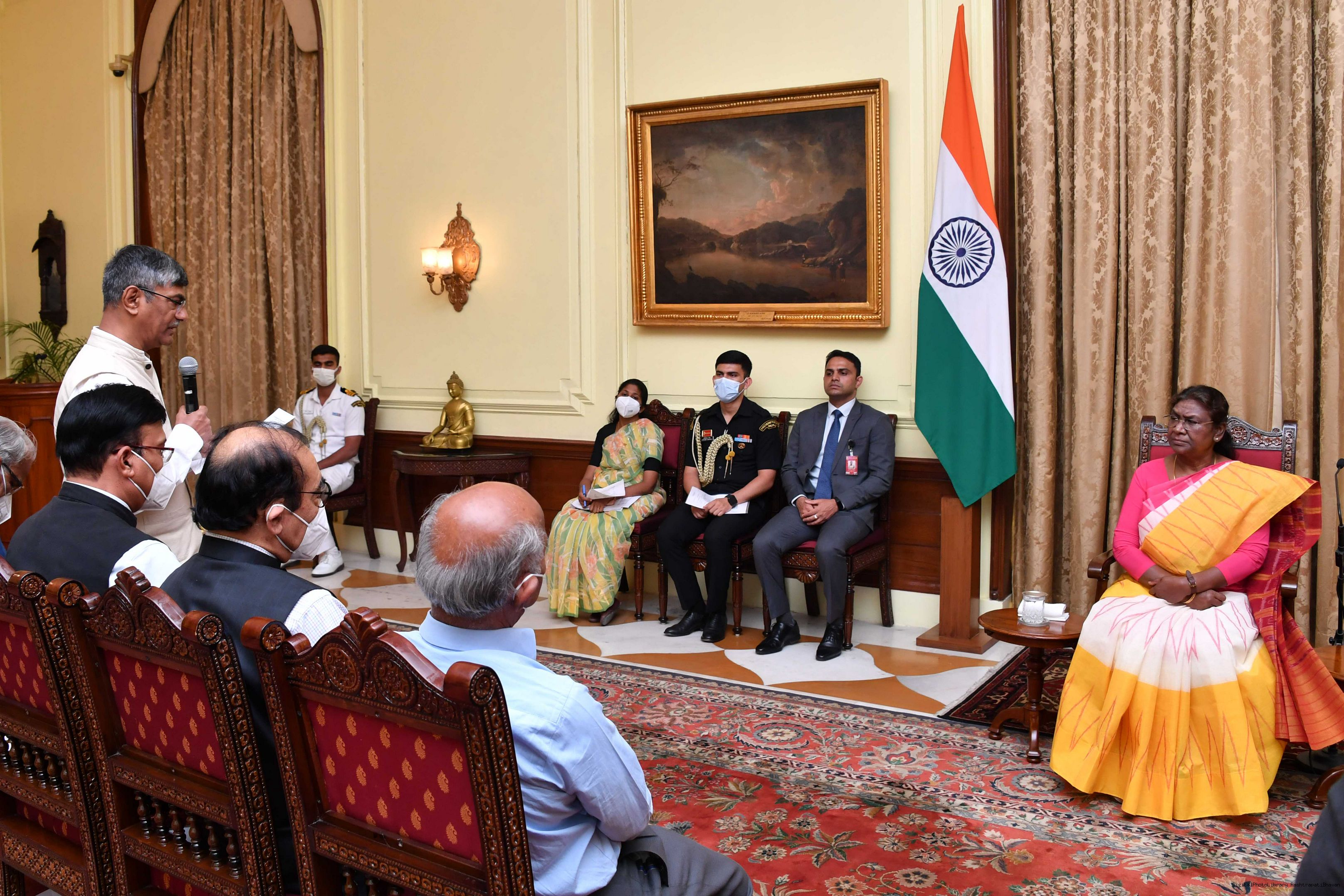 The President of India, Smt Droupadi Murmu presentation of Rapportization Summary of the outcome of the five round table (FINE-2023)[Secretary, ASP, Press Secretary, MSP, Addl. Press Secretary, PSP} at Rashtrapati Bhavan on April 13, 2023