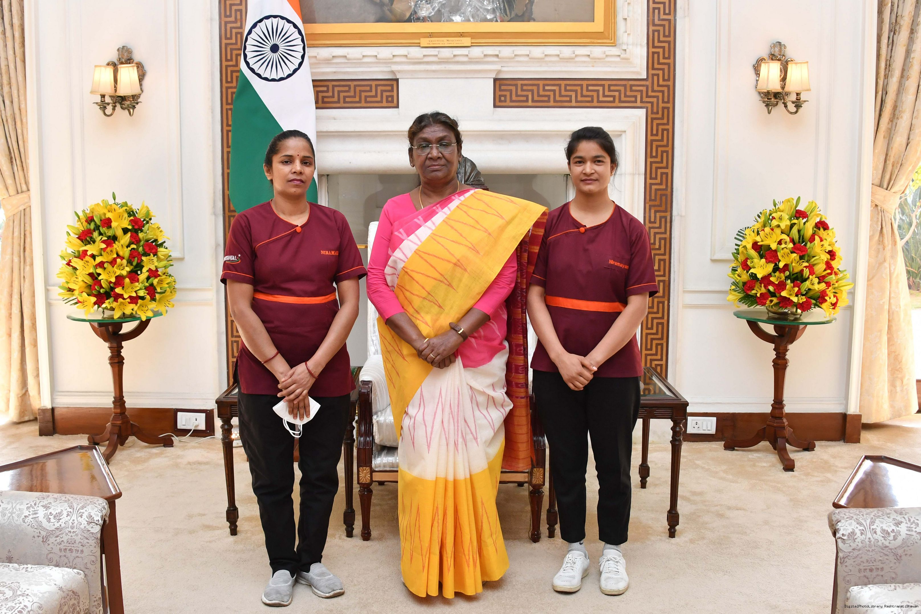 The President of India Smt. Droupadi Murmu posing a Group Photograph with Ms. Shivani Bhatt and Ms. Kiran Singh, Therapists of Patanjali Niramayam at Rashtrapati Bhavan on April 13, 2023