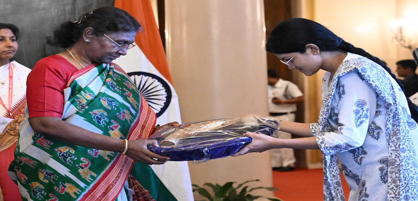 Shri Prathvaj hegde along Smt Madhavi Ravuri and Shri Subodh kumar meeting with the President of India, Smt. Droupadi Murmu, at Rashtrapati Bhavan on March 25, 2023.