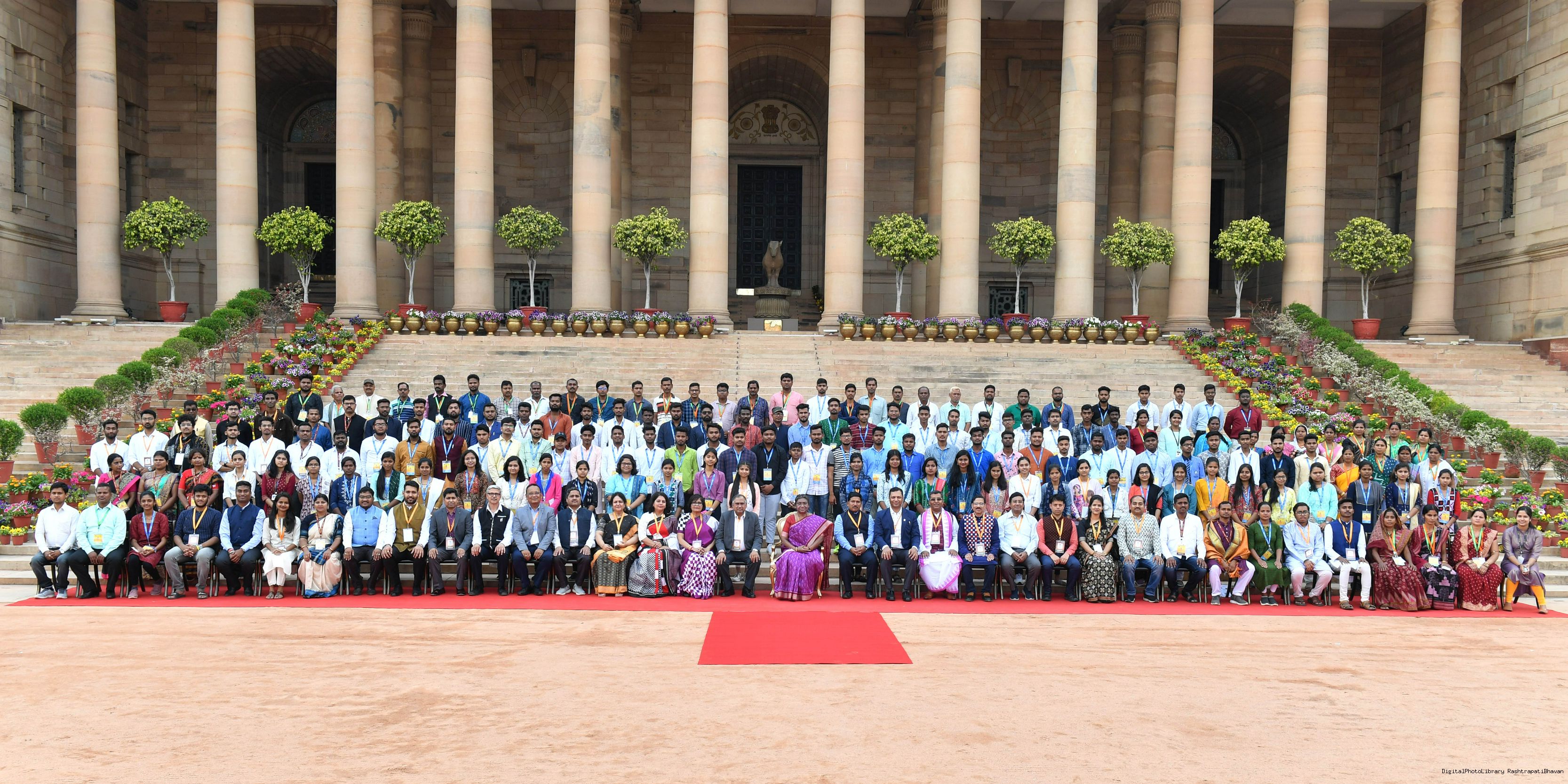 The President of India, Smt. Droupadi Murmu posing a group photograph with students farmers and others of odisha attending odisha parba festival orgainsed by odia samaj at Rashtrapati Bhavan on March 25, 2023