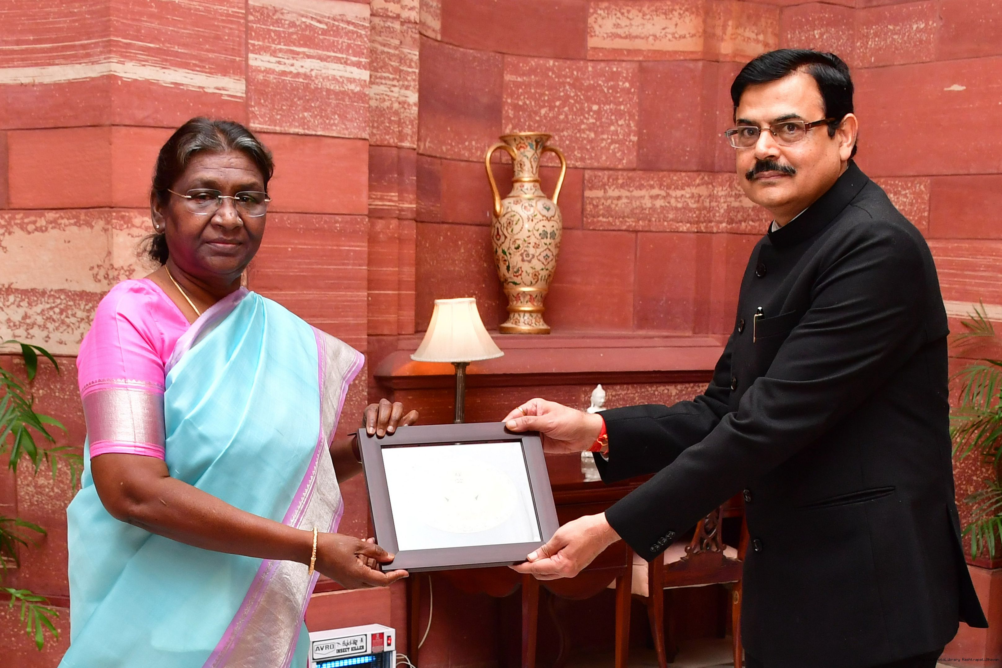 Shri R.K. Sinha Ex. MP (RS) meeting with the President of India, Smt. Droupadi Murmu at Rashtrapati Bhavan on March 14, 2023.