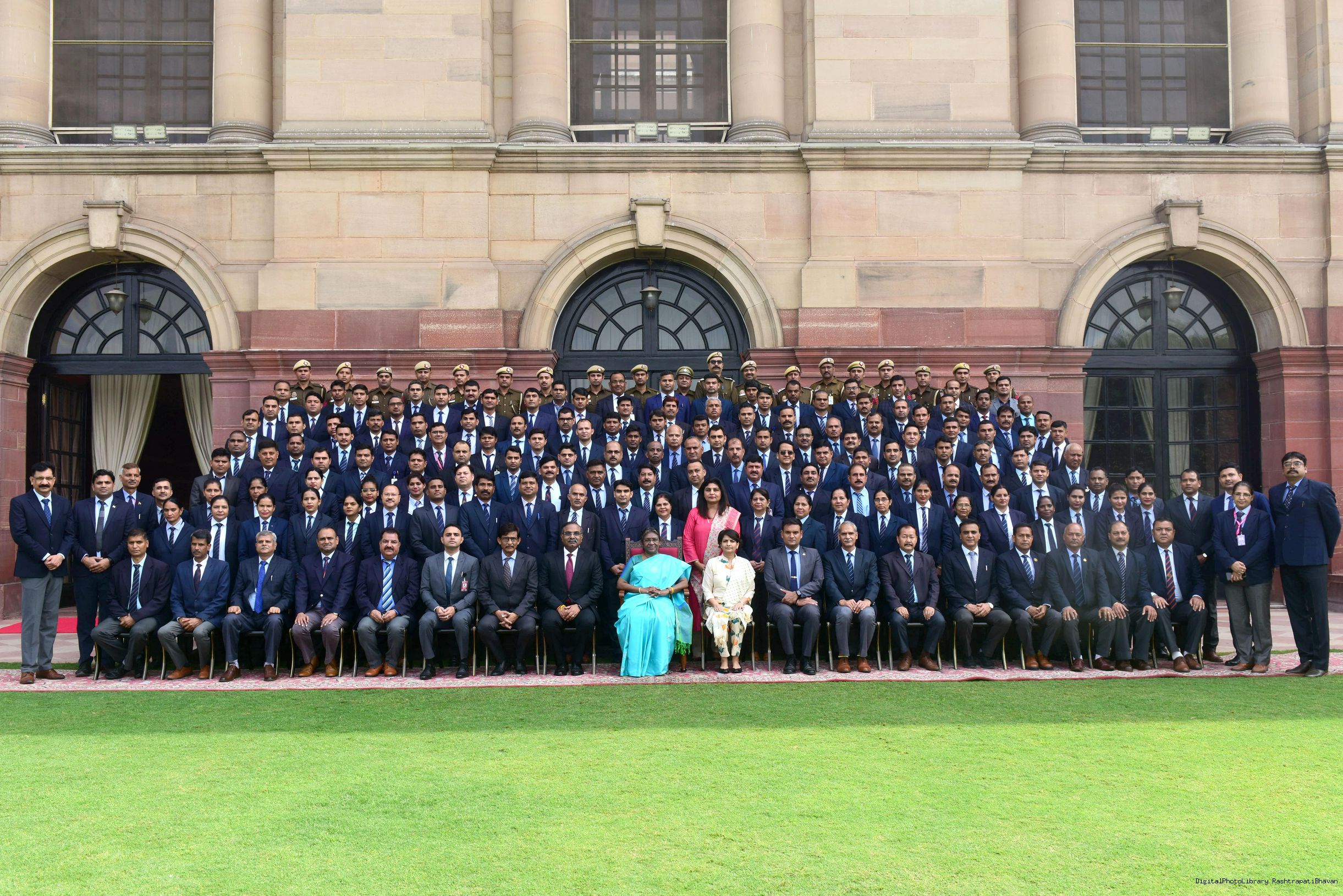 The President of India Smt. Droupadi Murmu posing a Group photograph with the Delhi Police personnel attached with the Rashtrapati Bhavan on the occasion of Raising Day of Delhi Police at Rashtrapati Bhavan on February 22, 2023.