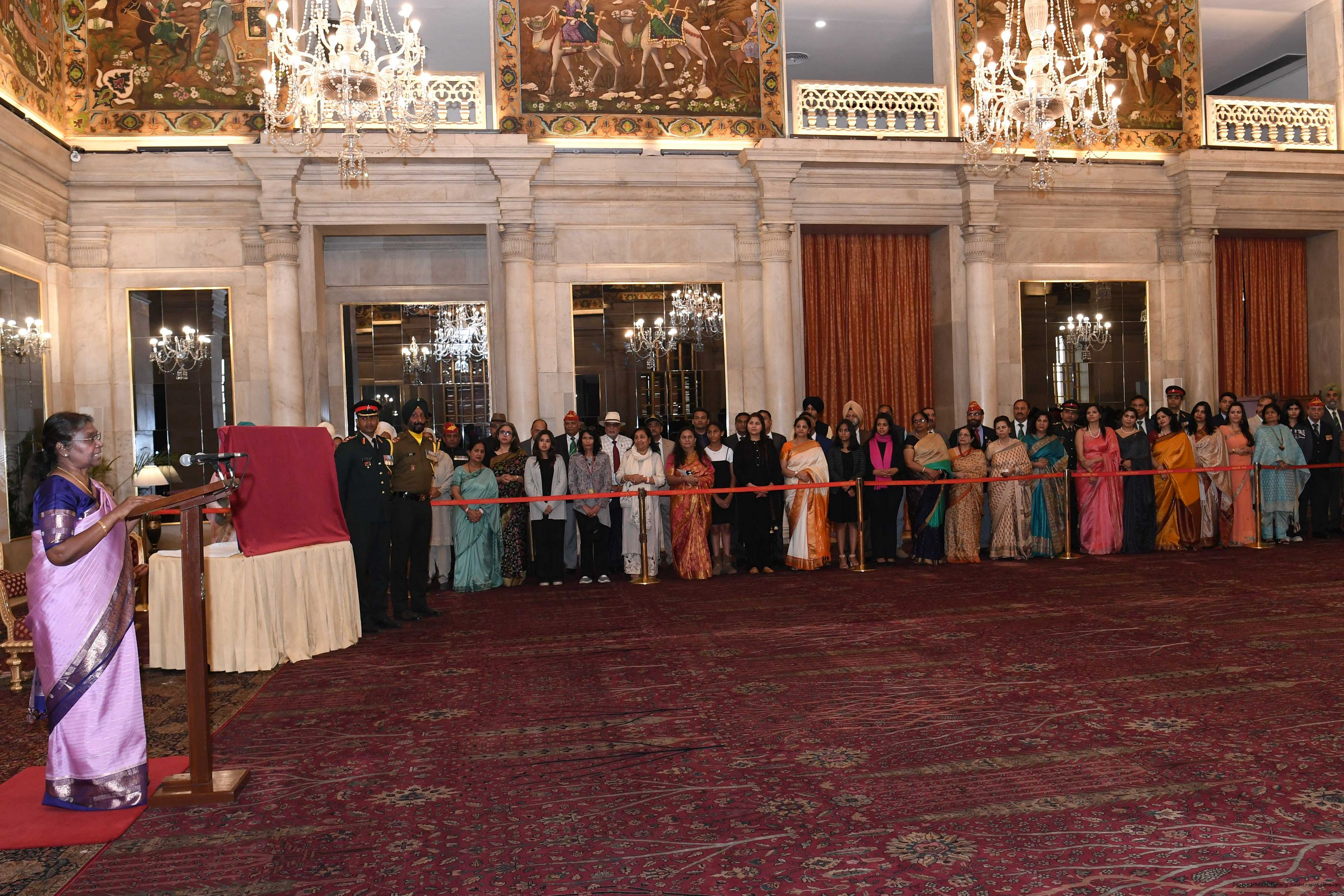 The President of India Smt. Droupadi Murmu meeting with personnel and families of 6 SIKH (Ceremonial Batallion) on the occasion of their 62th Raising Day at Rashtrapati Bhavan on February 09, 2023