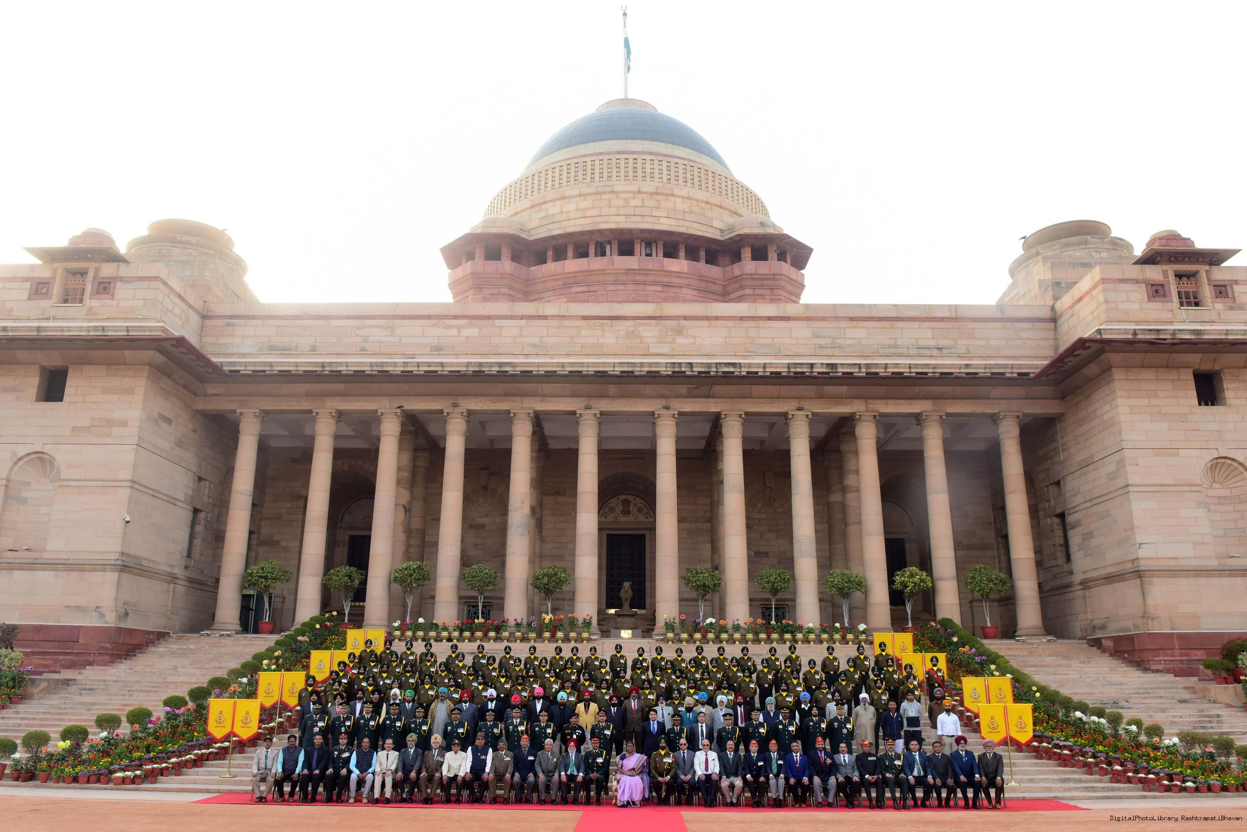 The President of India Smt. Droupadi Murmu posing a Group Photographs with the Officers, JCOs, Ors and Veterans of 6 SIKH (Ceremonial Batallion) at Rashtrapati Bhavan on February 09, 2023