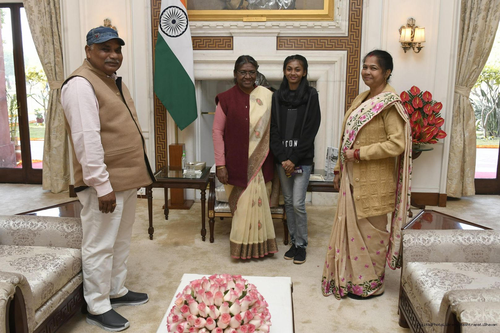 Shri Satish Chandra Pratihari of Badampahar, Mayurbhanj along with other meeting with the President of India Smt. Droupadi Murmu at Rashtrapati Bhavan on January 28, 2023.