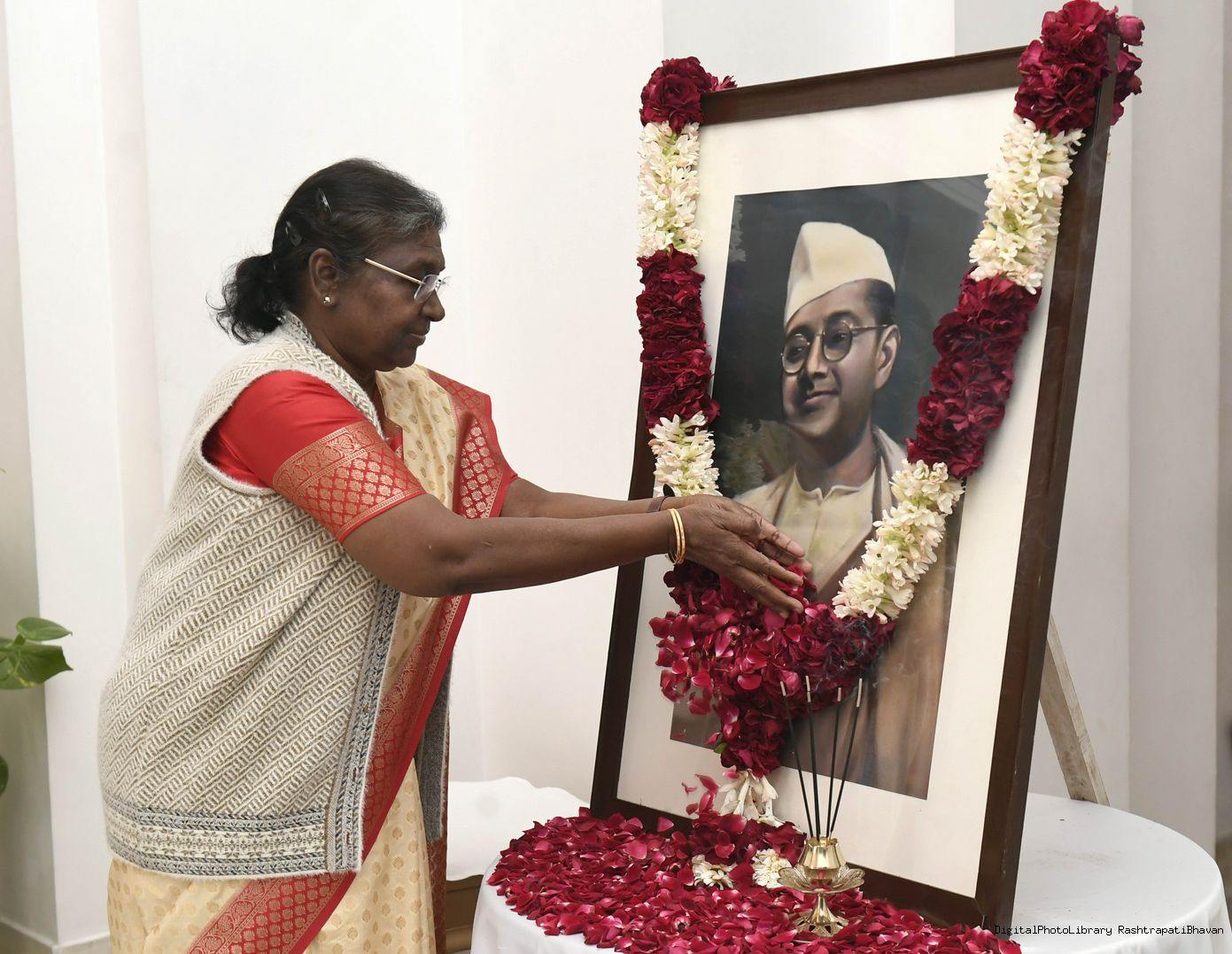 The President of India, Smt. Droupadi Murmu paid floral tributes to Netaji Subhash Chandra Bose on his birth anniversary, at Rashtrapati Bhavan on January 23, 2023.