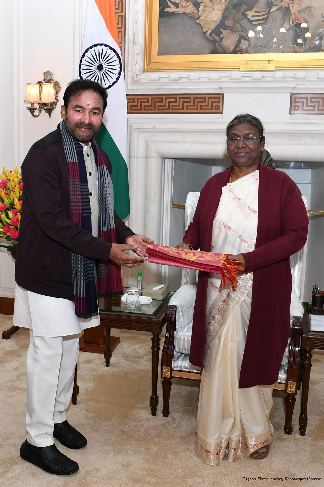 The Minister of Culture, Tourism Development of North Eastern Region (DoNER), Shri G. Kishan Reddy called on the President of India Smt. Droupadi Murmu at Rashtrapati Bhavan on January 11, 2023.