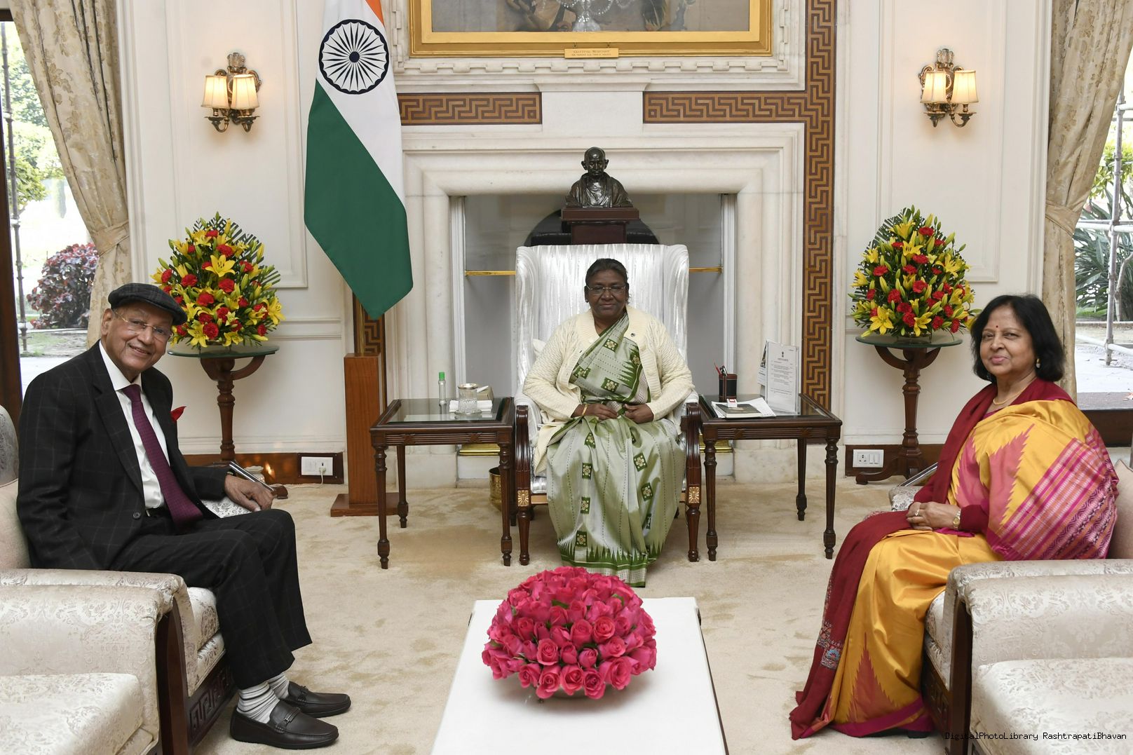 Shri Justice G.B. Patnaik (Retd.), former Chief Justice, Supreme Court of India along with his wife meeting with the President of India Smt. Droupadi Murmu at Rashtrapati Bhavan on January 17, 2023.