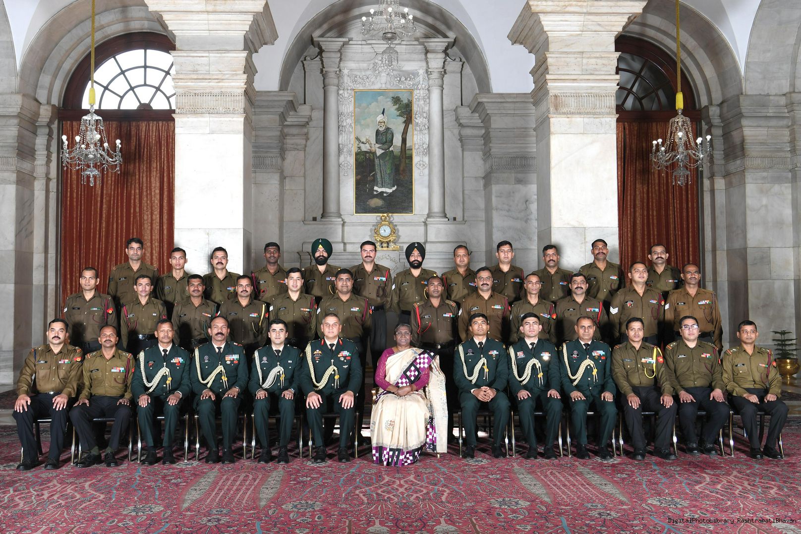 The President of India Smt. Droupadi Murmu posing a Group Photograph with the Army Personal attached with the Rashtrapati Bhavan on the occasion of Army Day on January 16, 2023.