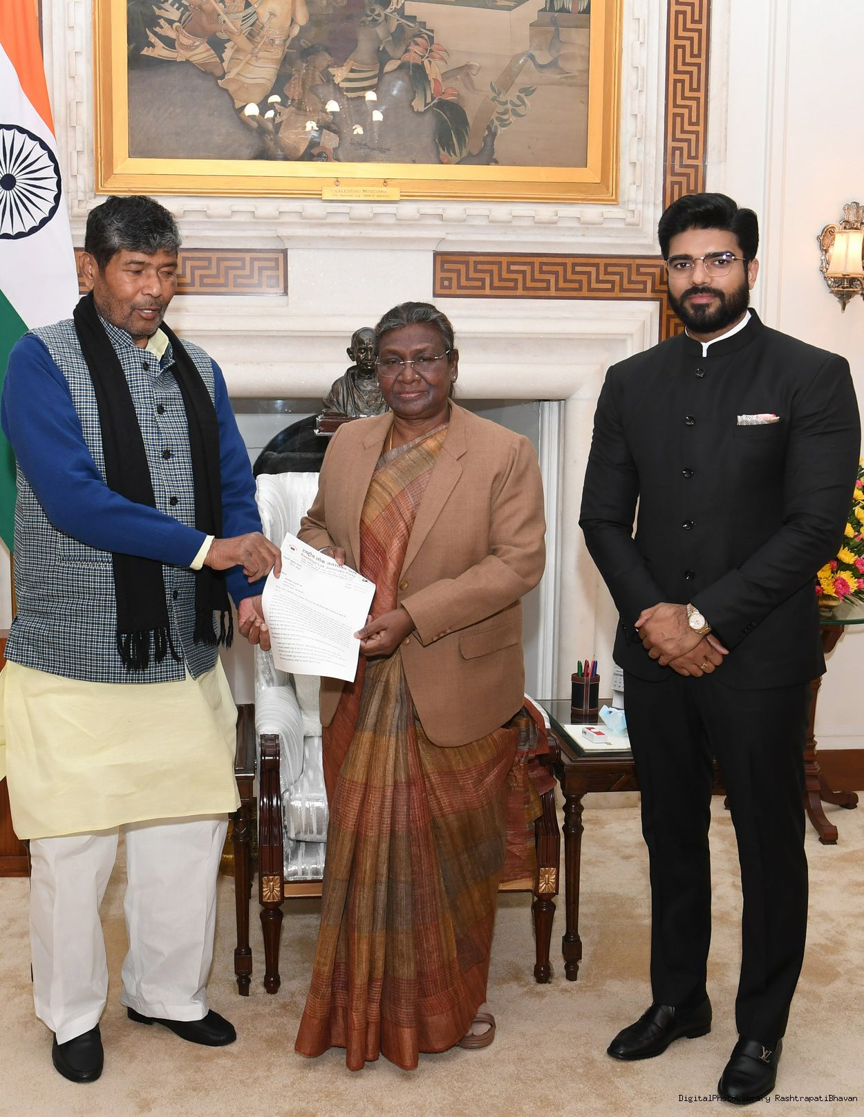 Shri Pashupati Kumar Paras, Union Minister of Food Processing Industries along with Prince Raj, MP (LS) and Shri Chandan Singh, MP (LS) meeting with the President of India Smt. Droupadi Murmu at Rashtrapati Bhavan on January 06, 2023