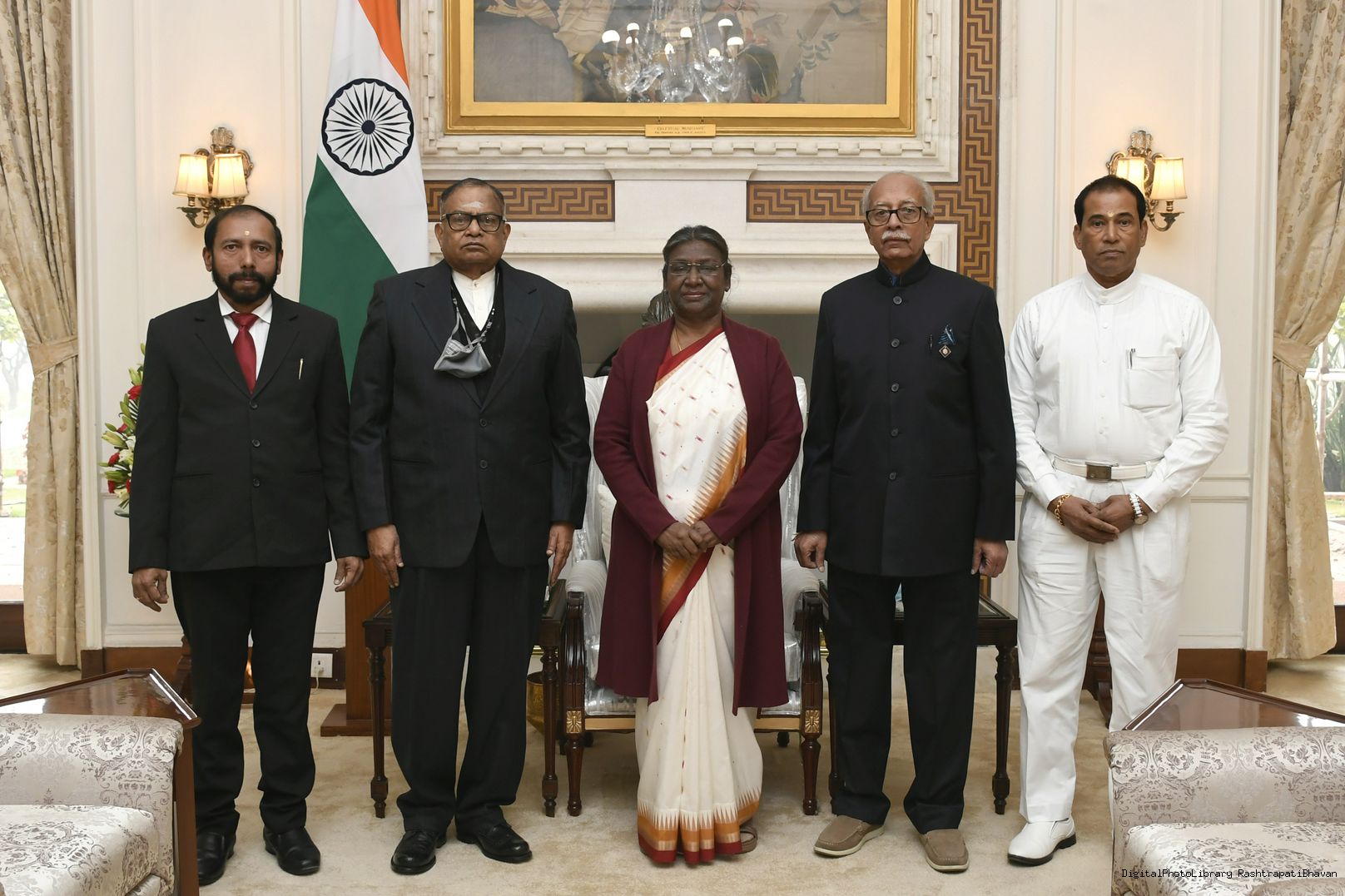 Shri Justice K. Ramamoorthy (Retd.), Chairman Advisory Board along with others from Pushpvihar Ayyappa Sewa Samithi, New Delhi meeting with the President of India Smt. Droupadi Murmu at Rashtrapati Bhavan on January 09, 2023.