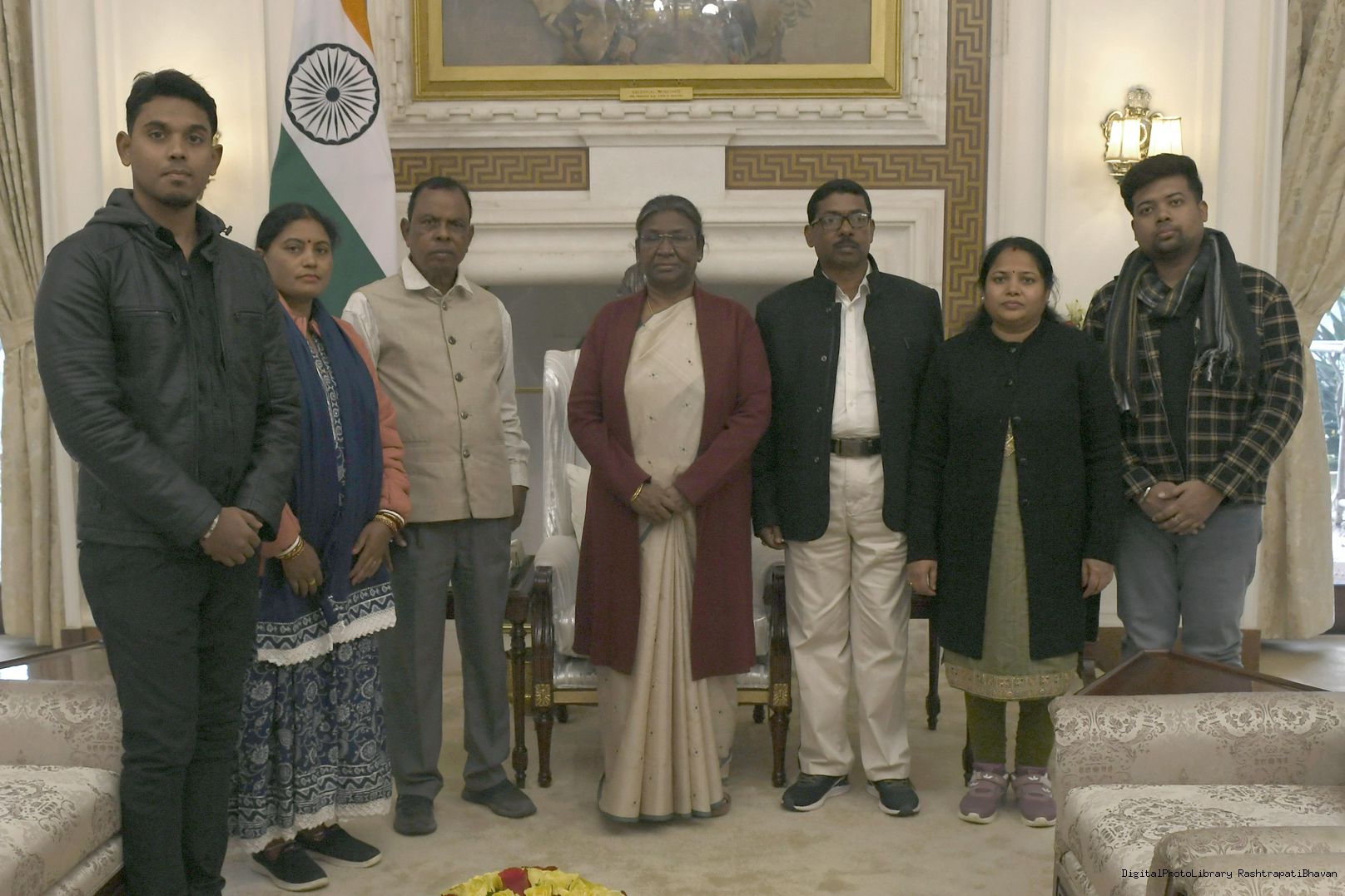 Shri Khelaram Mahali, ex. MLA, Bahalda, Mayurbhanj along with others meeting with the President of India Smt. Droupadi Murmu at Rashtrapati Bhavan on January 09, 2023.