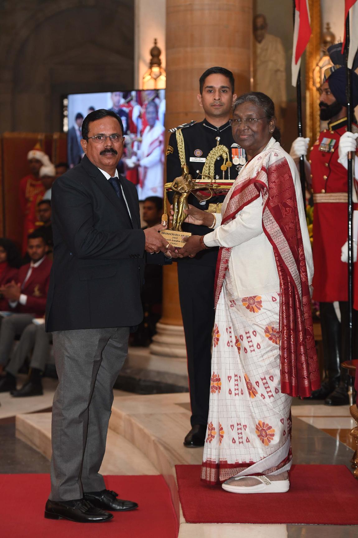 The President of India, Smt. Droupadi Murmu presenting Dronacharya Awards, 2022, at the Sports & Adventure Awards function, at Rashtrapati Bhavan on November 30, 2022.