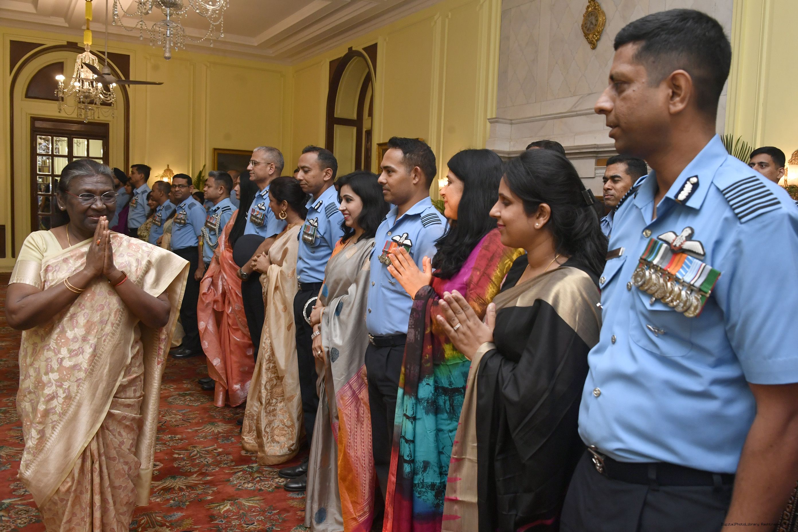 Air Cmde Sanjeev Vashishth, VM, AOC, AFS Palam and Group Capt Rishabh Mittal, VSM, CO, Air HQ Communication Squadron along with others meeting with the President of India, Smt. Droupadi Murmu, at Rashtrapati Bhavan on Nov 01, 2022.