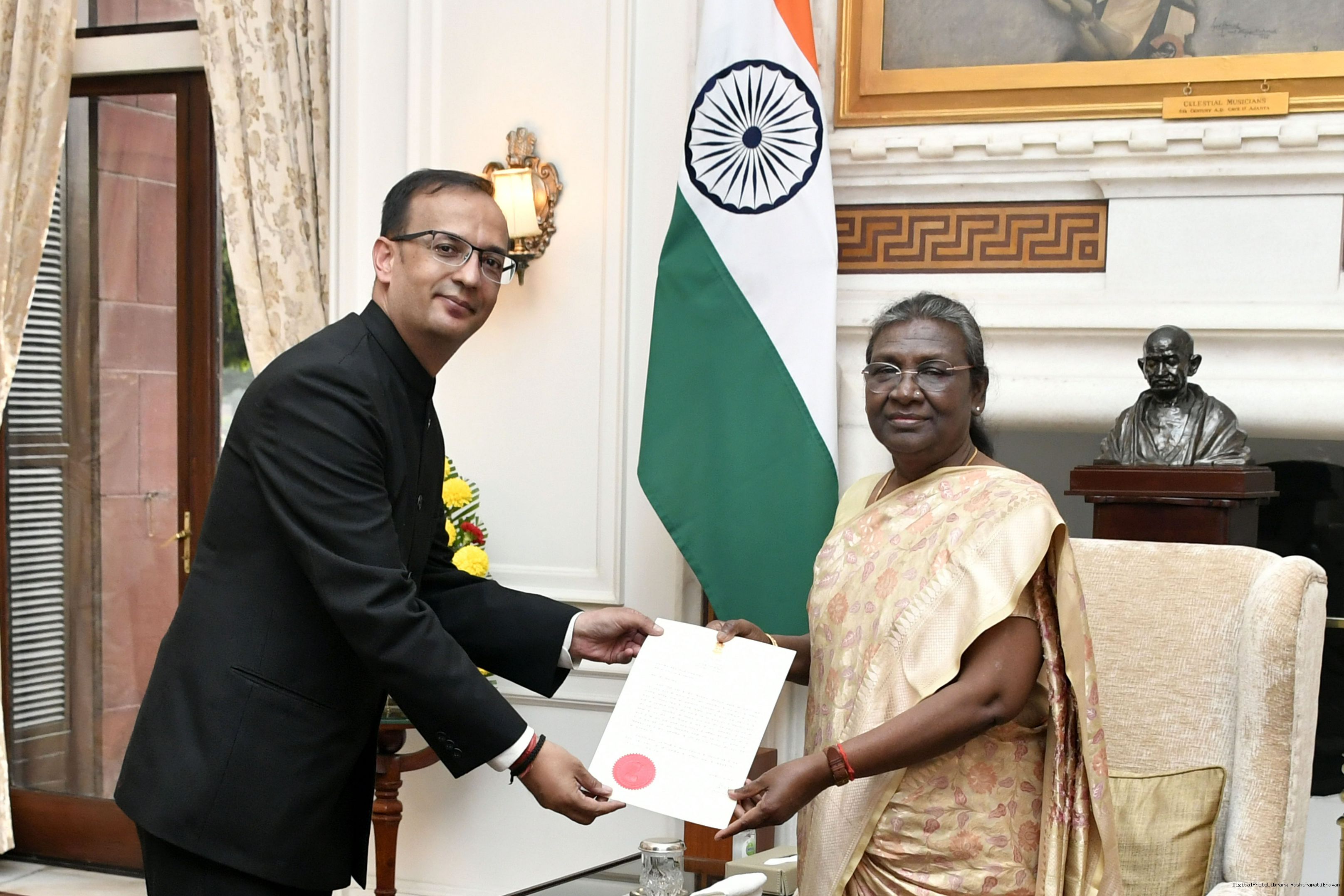 Shri Kartik Pande, High Commissioner-designate of India to Seychelles meeting with the President of India, Smt. Droupadi Murmu, at Rashtrapati Bhavan on Nov 01, 2022.