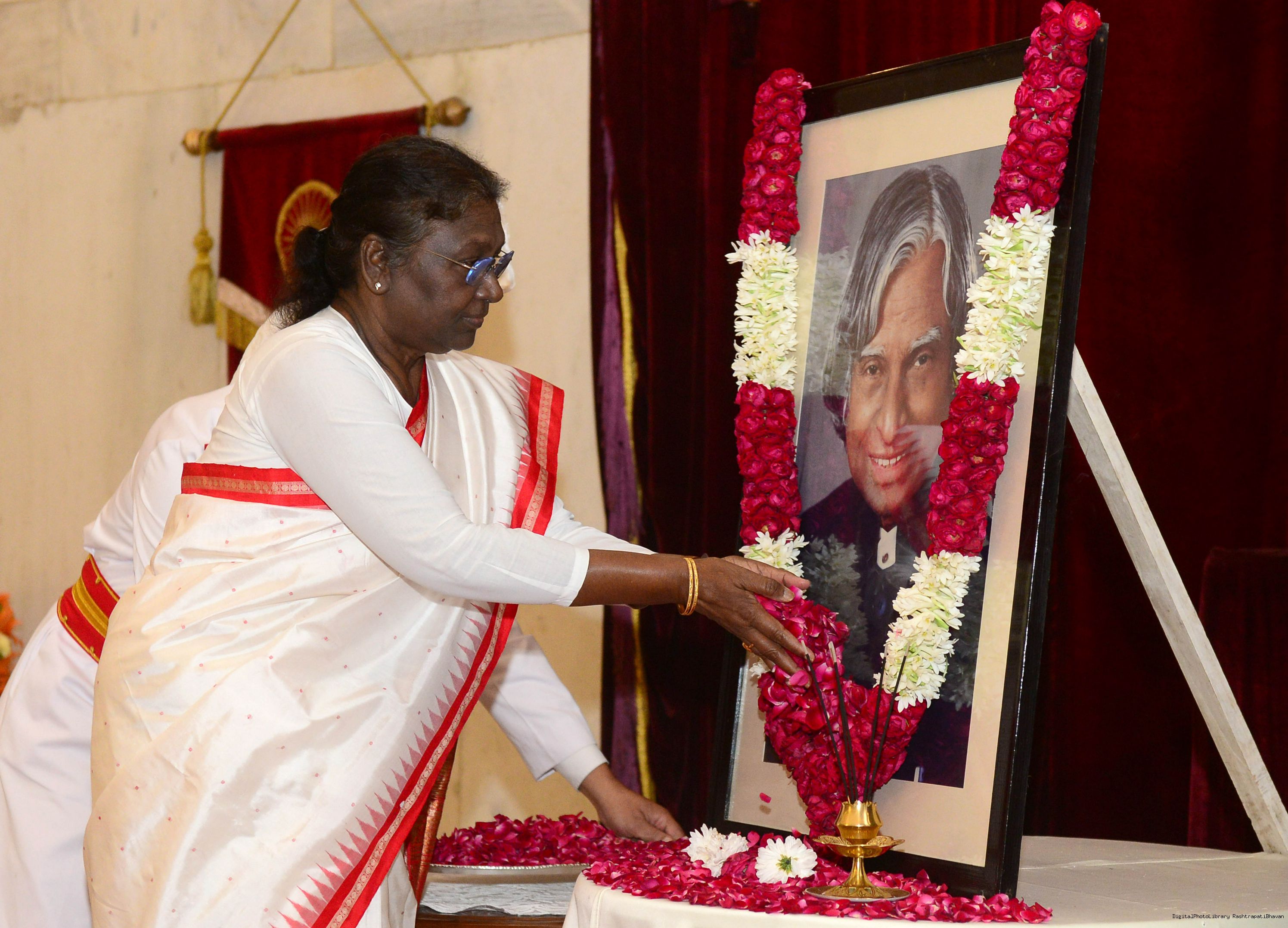 The President of India, Smt. Droupadi Murmu paid floral tributes to Dr. A.P.J. Abdul Kalam, former President of India, on his birth anniversary, at Rashtrapati Bhavan on October 15, 2022.