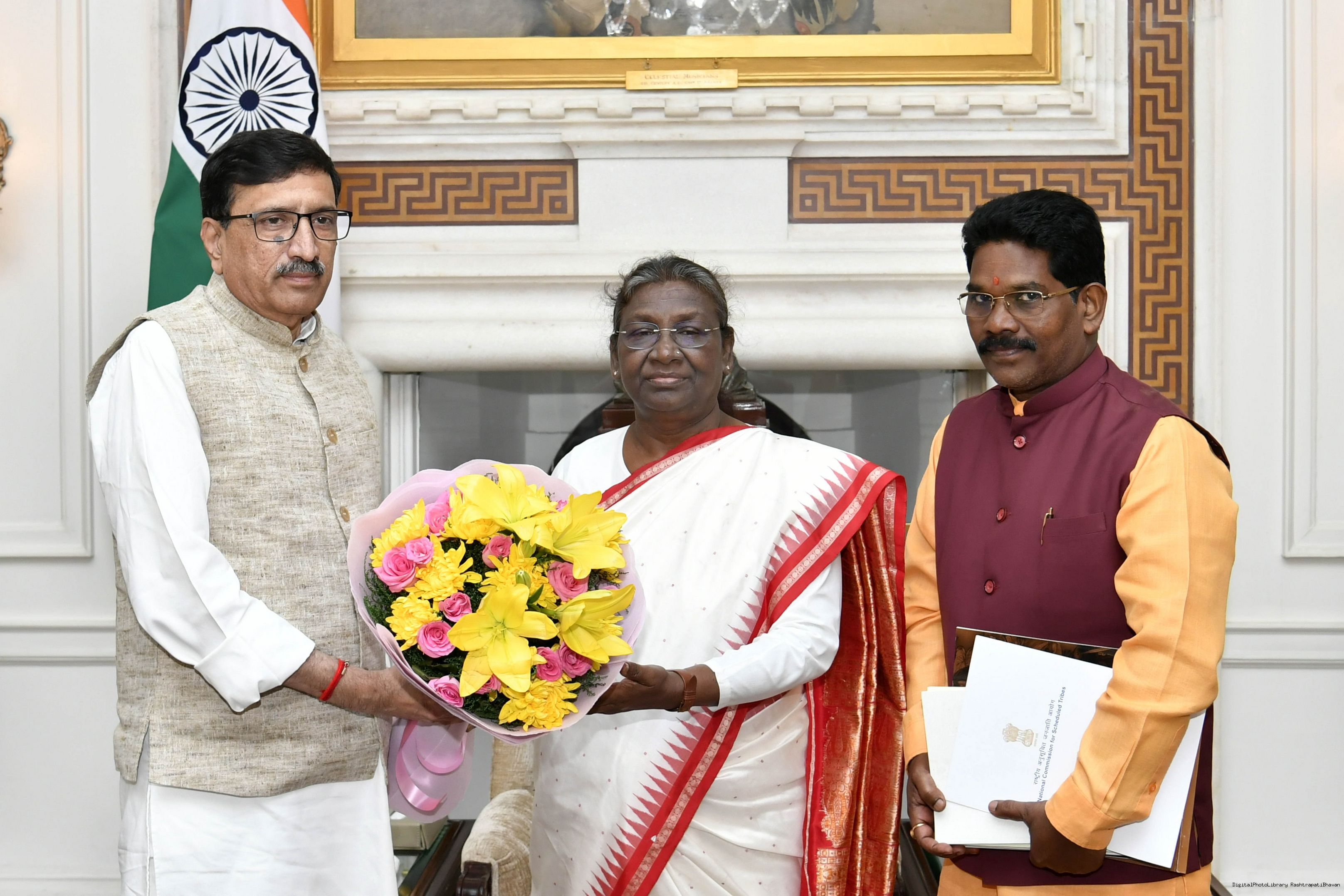 Shri Harsh Chouhan, Chairperson along with Shri Ananta Nayak, Member, National Commission for Scheduled Tribes meeting with the President of India, Smt. Droupadi Murmu, at Rashtrapati Bhavan on Oct 14, 2022.