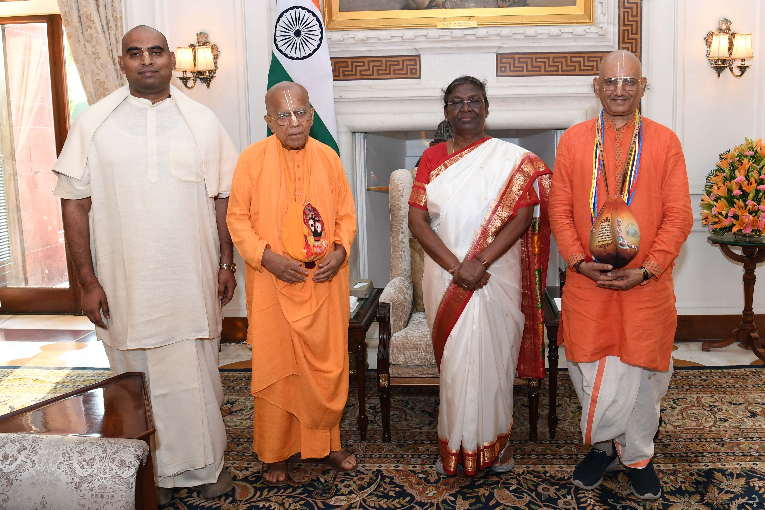 Shri Gopal Krishna Goswami Maharaja, Chairman along with others meeting with the President of India, Smt. Droupadi Murmu, at Rashtrapati Bhavan on Sep 29, 2022.