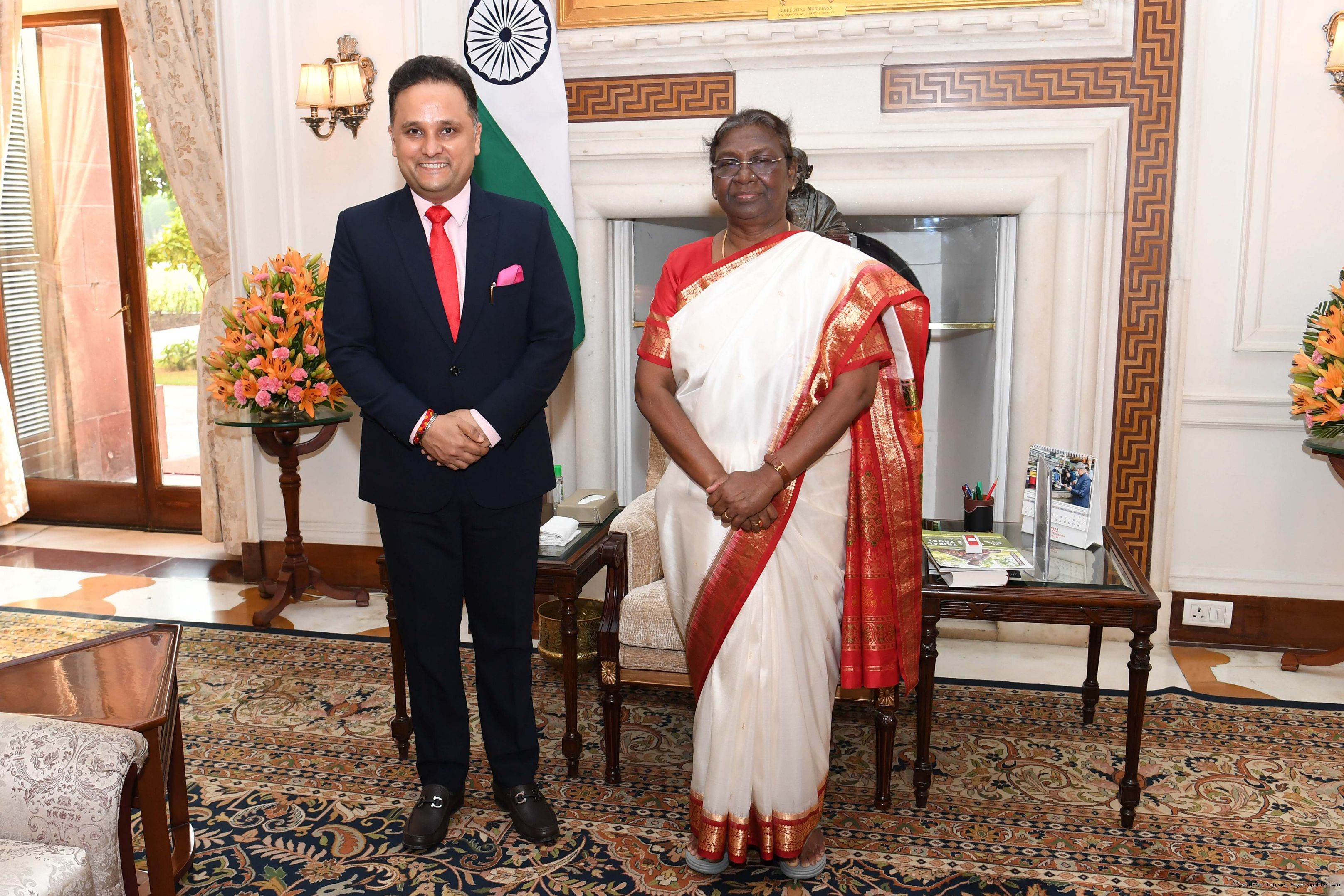 Shri Subhash Ramnath Pardhi, Member, National Commission for Scheduled Castes along with his son Shri Sujal Pardhi meeting with the President of India, Smt. Droupadi Murmu, at Rashtrapati Bhavan on Sep 29, 2022.