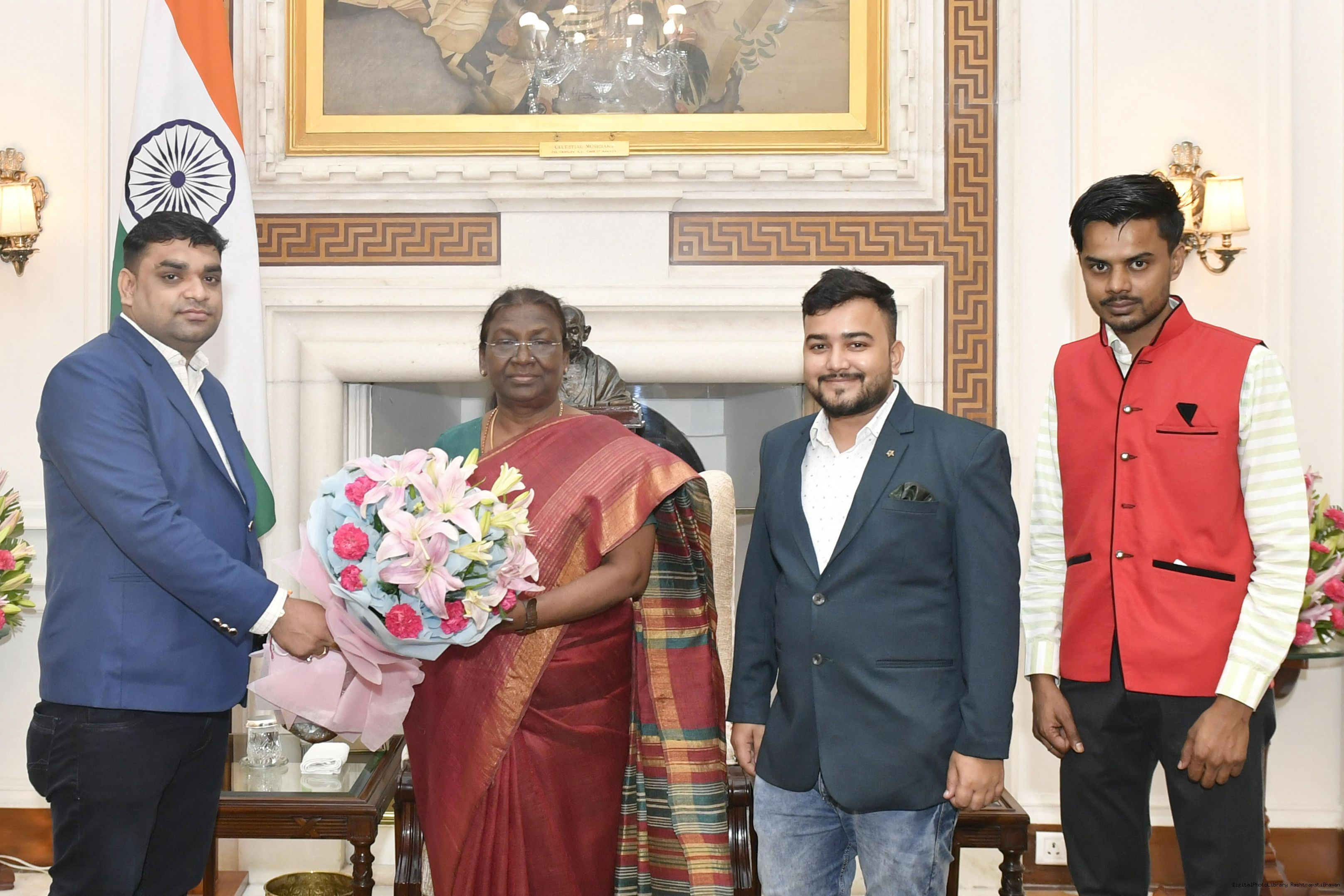 Shri Niranjan Davkere, MLC, BJP Maharashtra along with others meeting with the President of India, Smt. Droupadi Murmu, at Rashtrapati Bhavan on Aug 16, 2022.