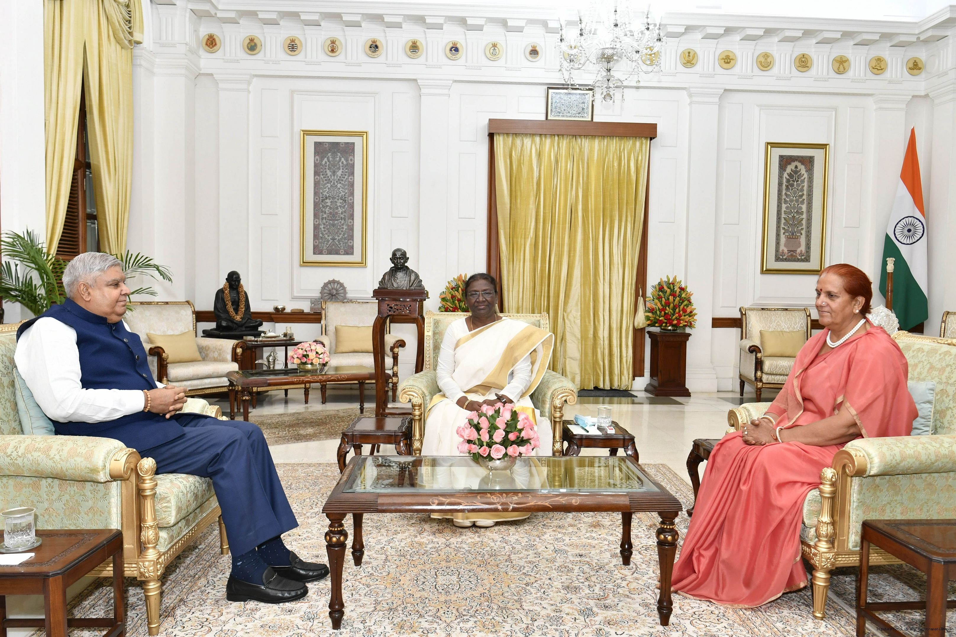 The Vice President of India, Shri Jagdeep Dhankhar along with his wife calling on the President of India, Smt. Droupadi Murmu, at Rashtrapati Bhavan on August 16, 2022.