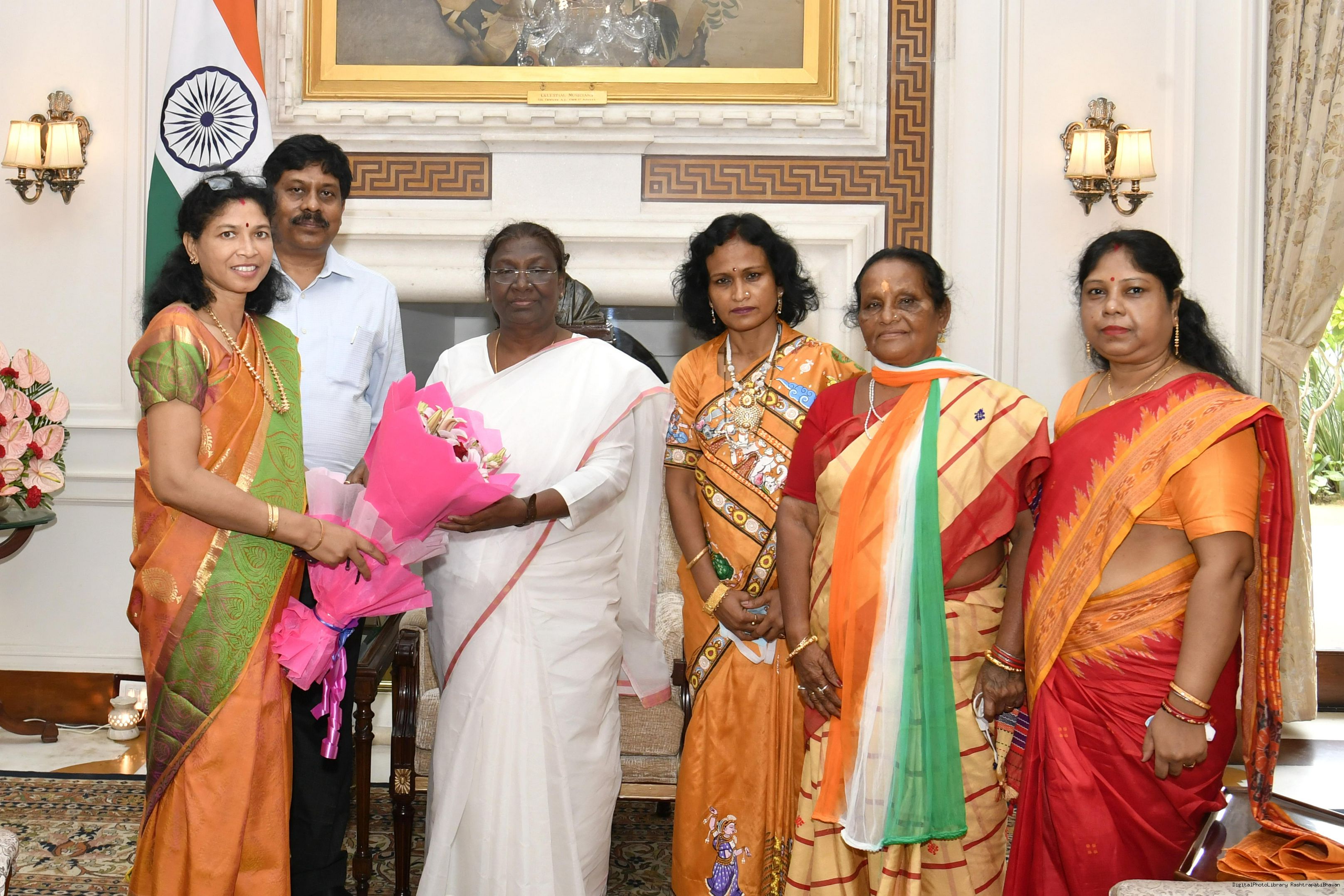 Shri Purna Chandra Hembram along with others meeting with the President of India, Smt. Droupadi Murmu, at Rashtrapati Bhavan on Aug 15, 2022.