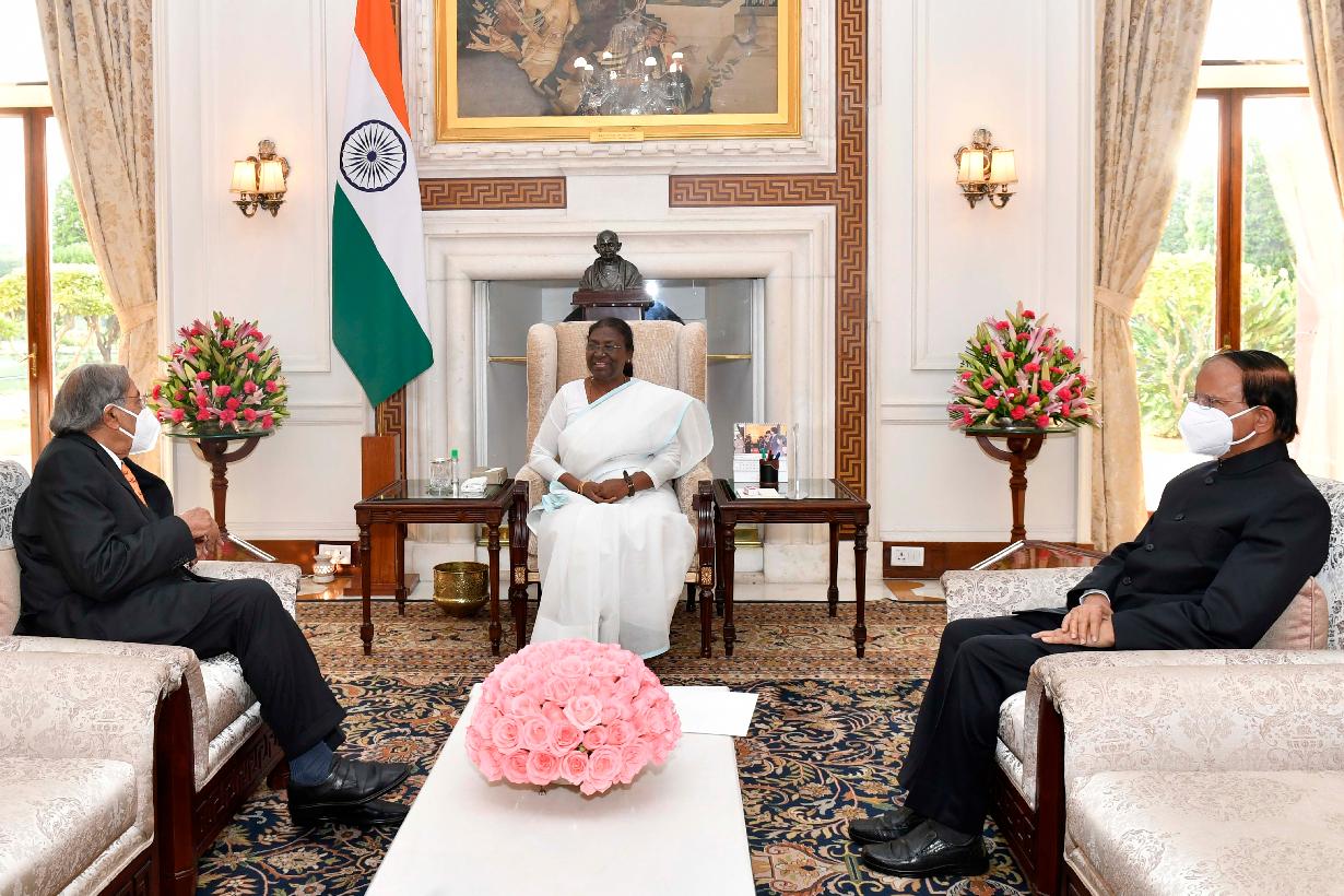 The Chairman of 15th Finance Commission and President of Institute of Economic Growth, Shri N.K. Singh along with the Principal Secretary to the Prime Minister, Dr. P.K. Mishra calling on the President of India, Smt. Droupadi Murmu, at Rashtrapati Bhavan on August 12, 2022.