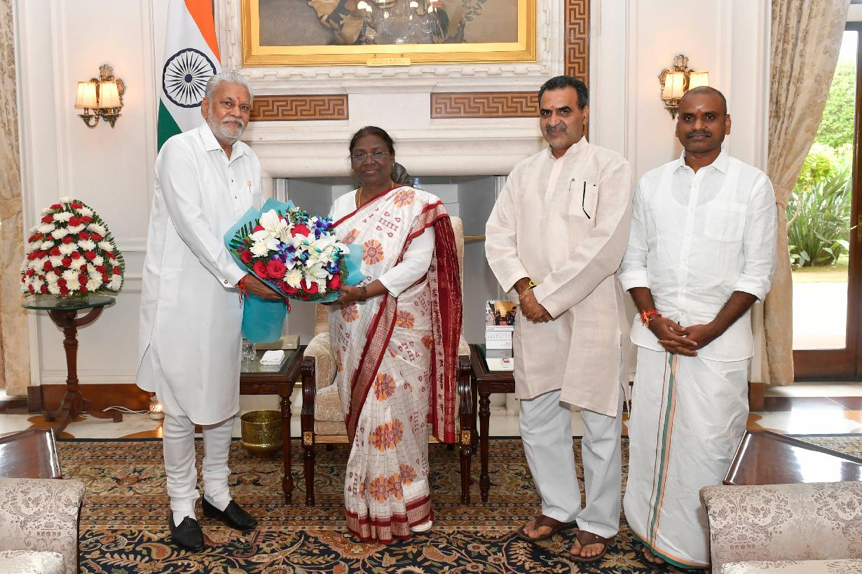 Shri R.K. Agarwal, All India President, Sri Godham Mahatirth Pathmedha Lok Punyarth Nayas meeting with the President of India, Smt. Droupadi Murmu, at Rashtrapati Bhavan on Aug 10, 2022.