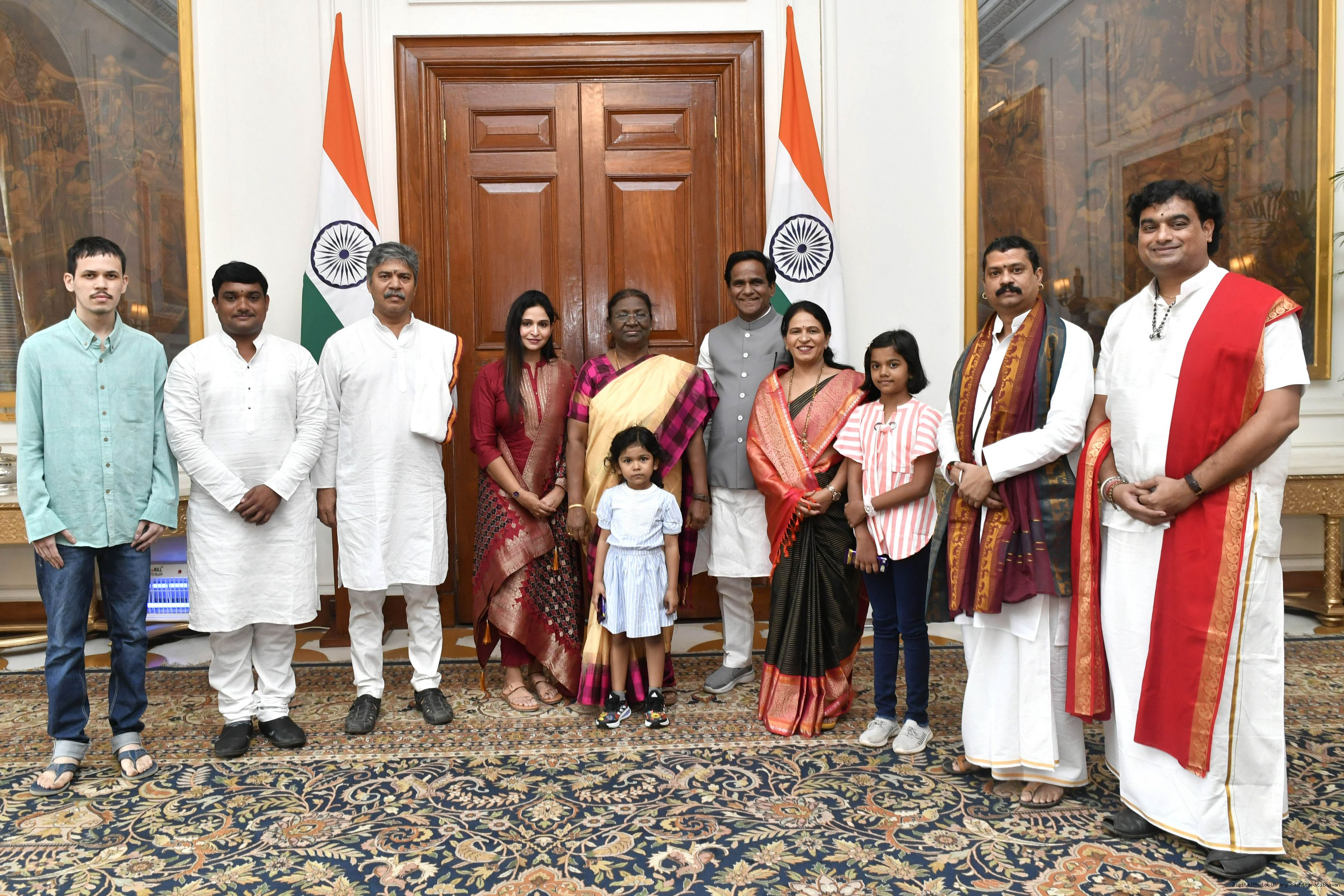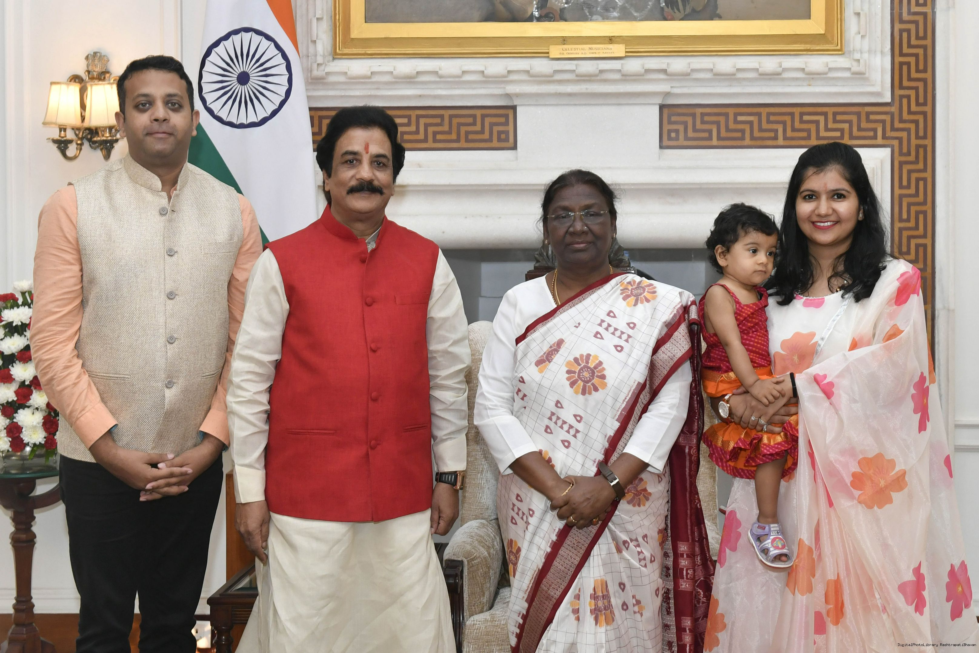 Shri Kishore Jain along with his son Shri Mayank Jain, daughter-in-law Smt. Ayushi Jain and granddaughter Ms. Anayasha Jain meeting with the President of India, Smt. Droupadi Murmu, at Rashtrapati Bhavan on Aug 11, 2022.