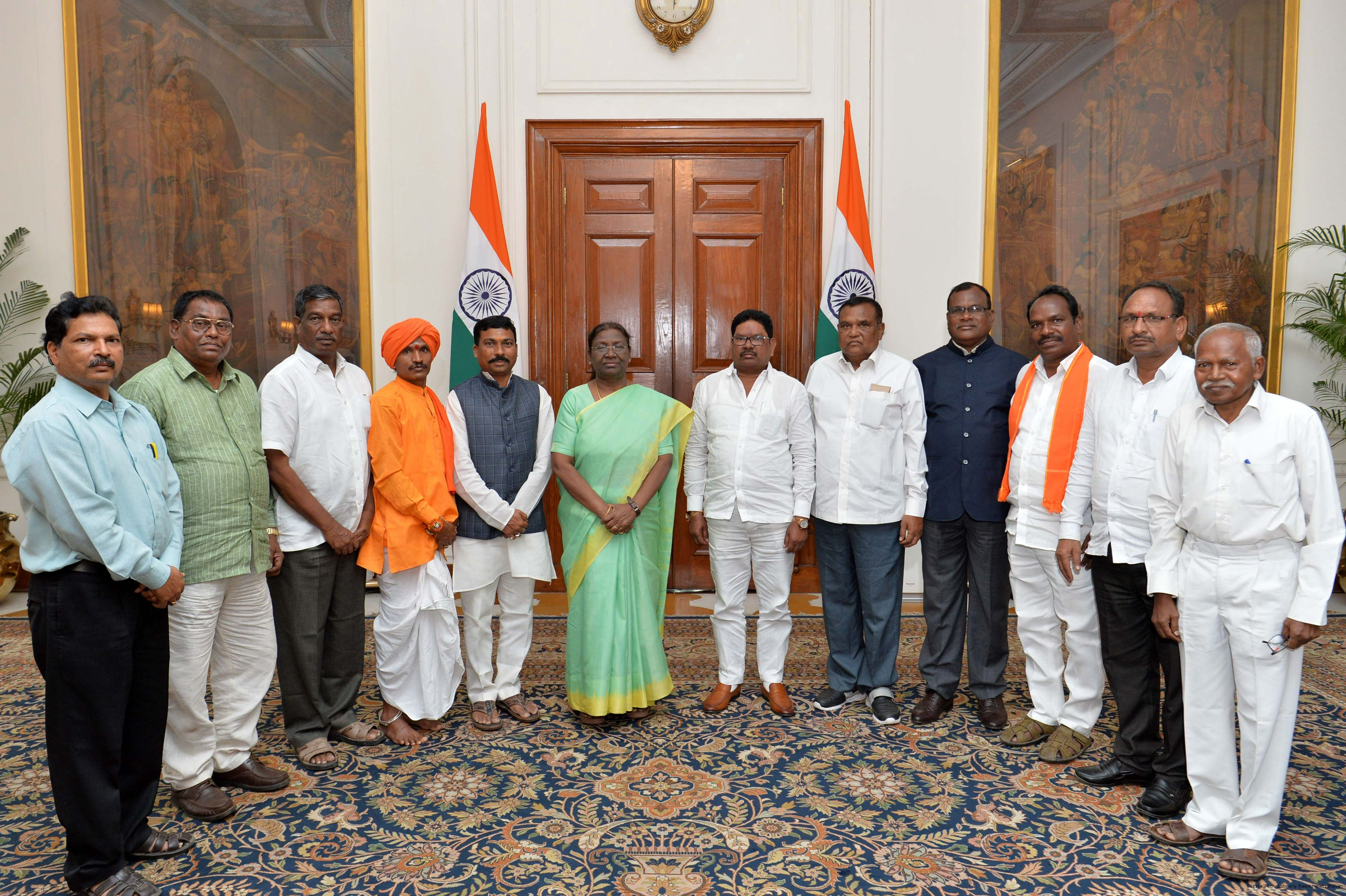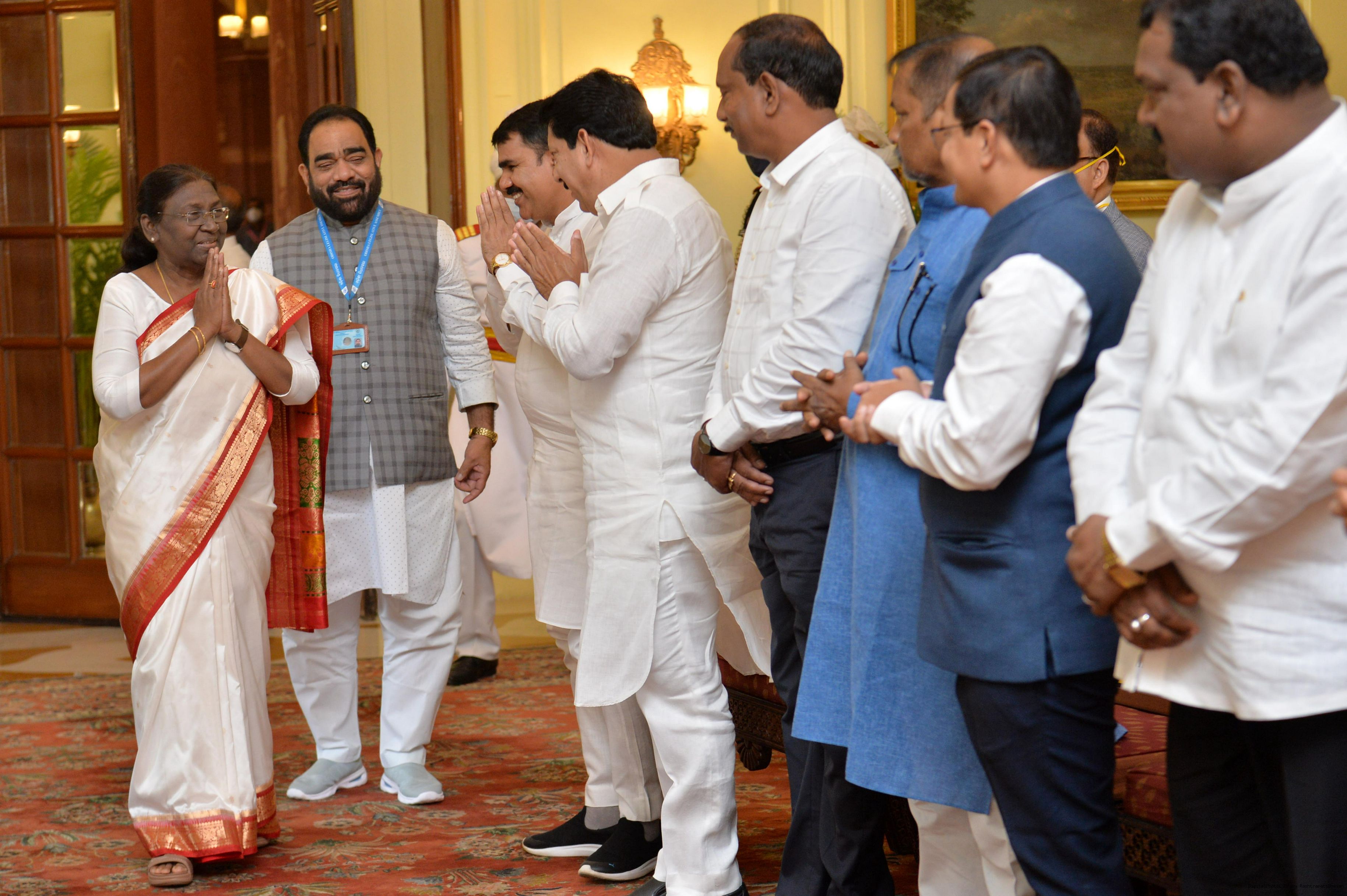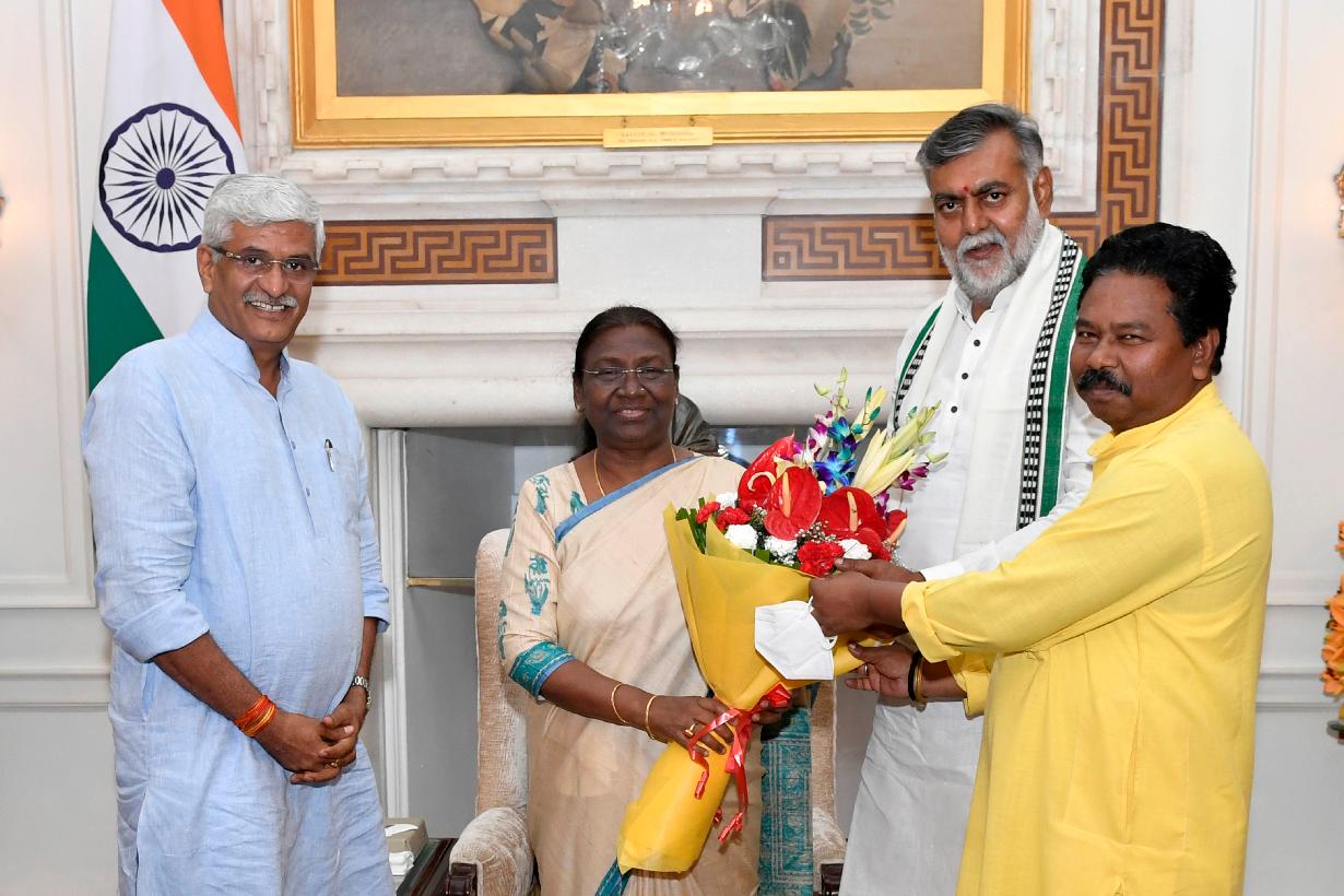 Shri Soyam Bapu Rao, MP (LS) along with 10 members ST Delegation form Telangana State meeting with the President of India, Smt. Droupadi Murmu, at Rashtrapati Bhavan on Aug 04, 2022.