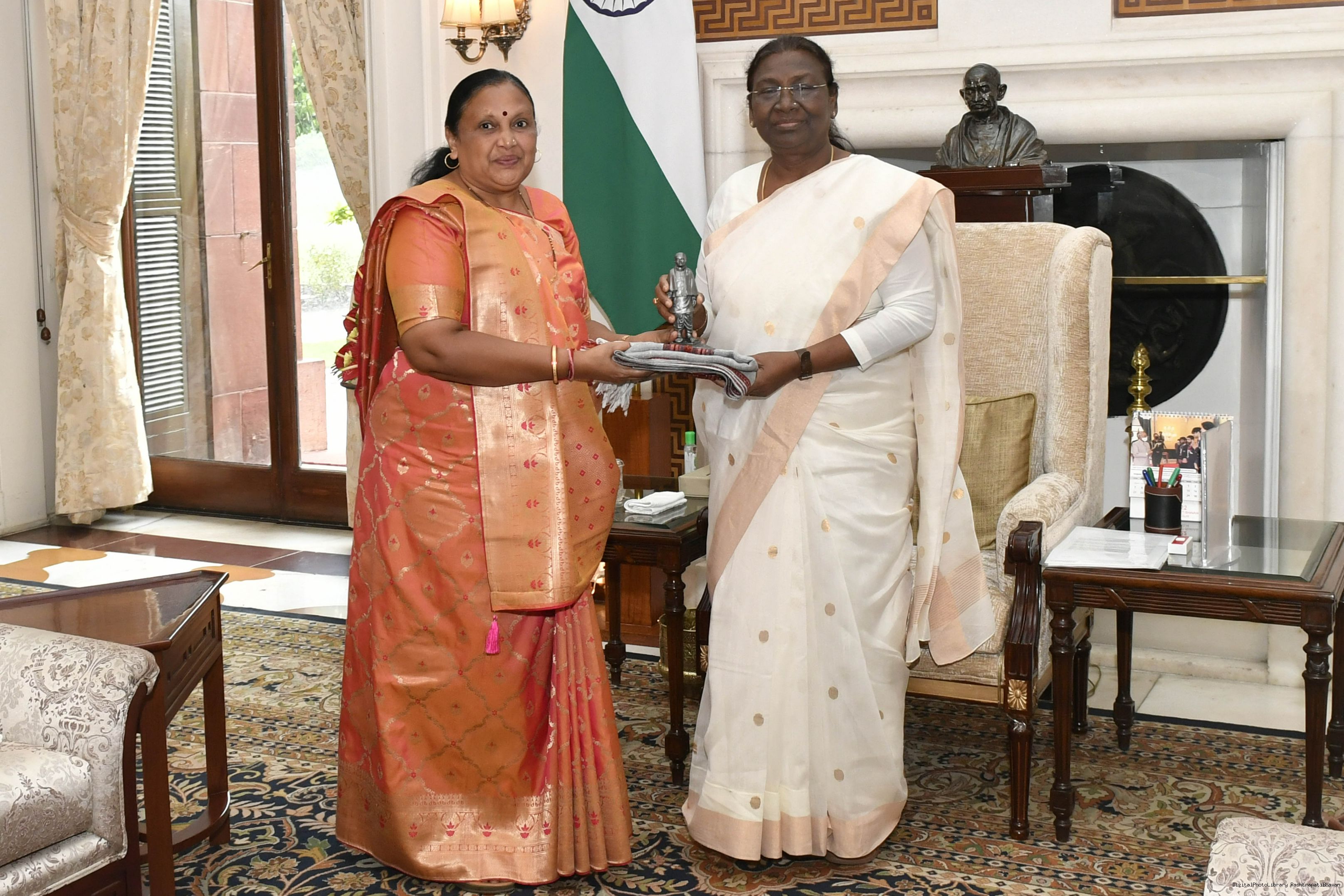 Smt Gitaben V. Rathva, MP(LS) meeting with the President of India, Smt. Droupadi Murmu, at Rashtrapati Bhavan on Aug 04, 2022.