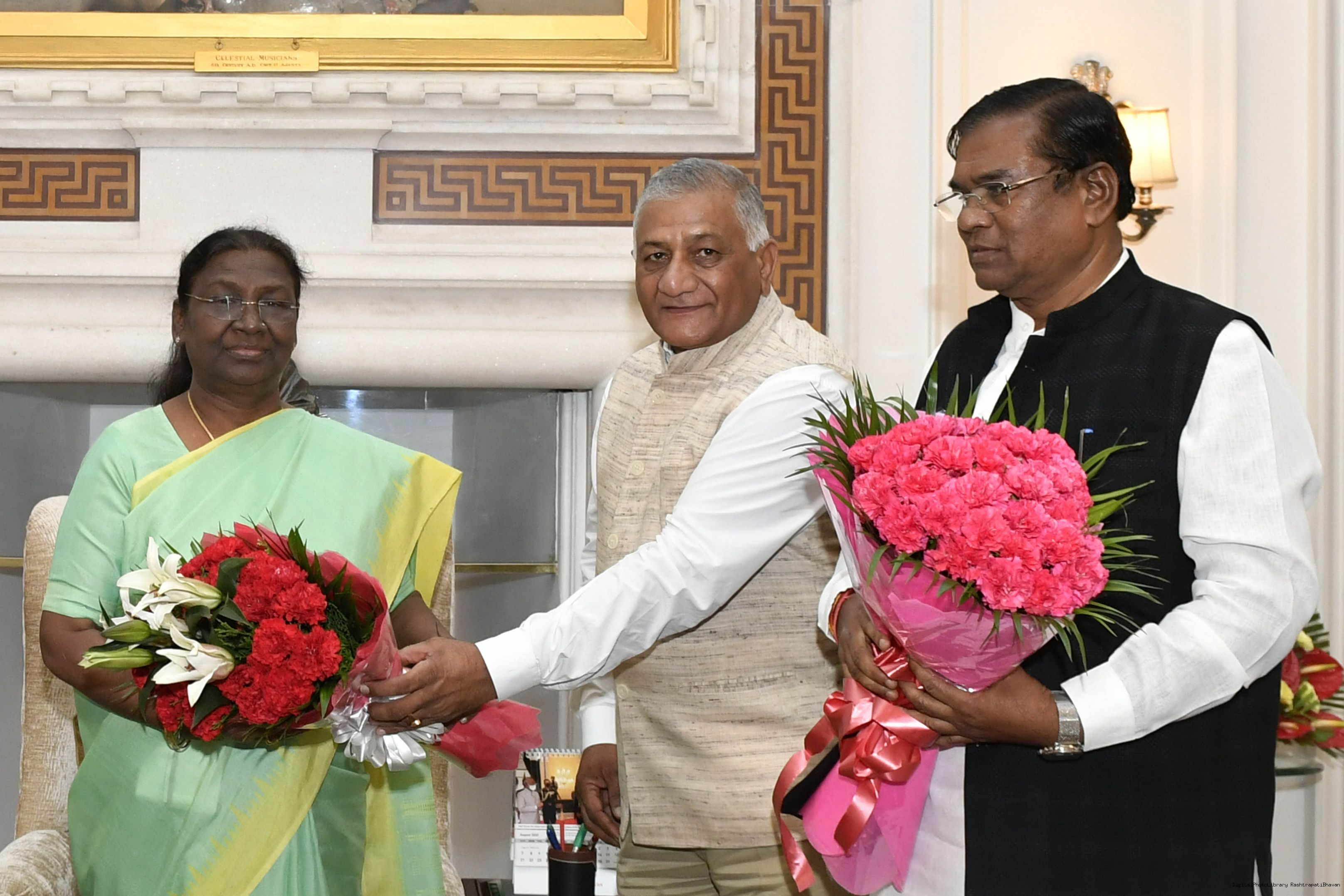 The Union Minister for Civil Aviation and Steel, Shri Jyotiraditya M. Scindia along with the Minister of State for Civil Aviation, Dr. V.K. Singh and the Minister of State for Steel, Shri Faggan Singh Kulaste calling on the President of India, Smt. Droupadi Murmu, at Rashtrapati Bhavan on August 04, 2022.