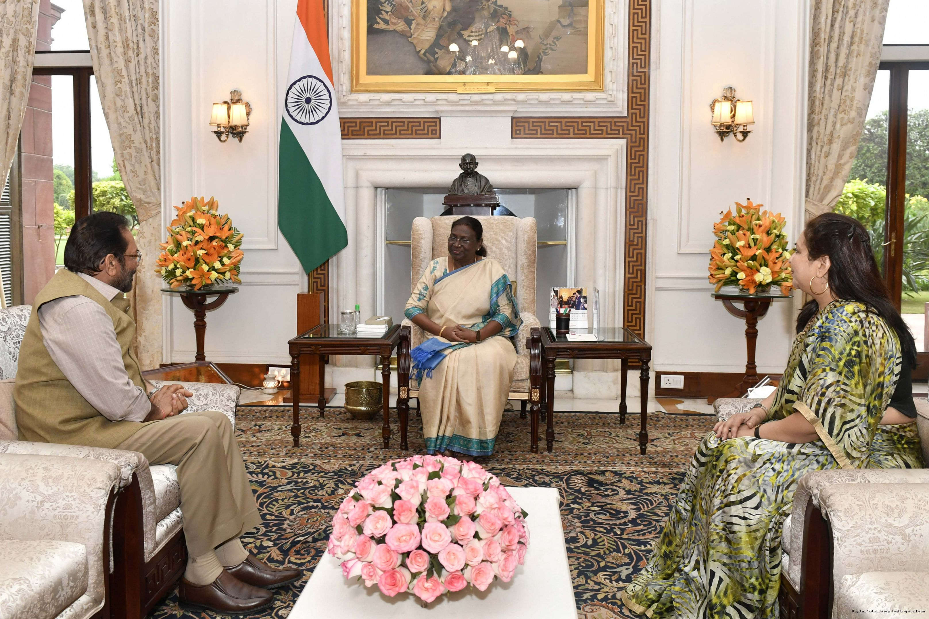 Shri Mukhtar Abbas Naqvi, former Union Minister along with others meeting with the President of India, Smt. Droupadi Murmu, at Rashtrapati Bhavan on Aug 03, 2022.