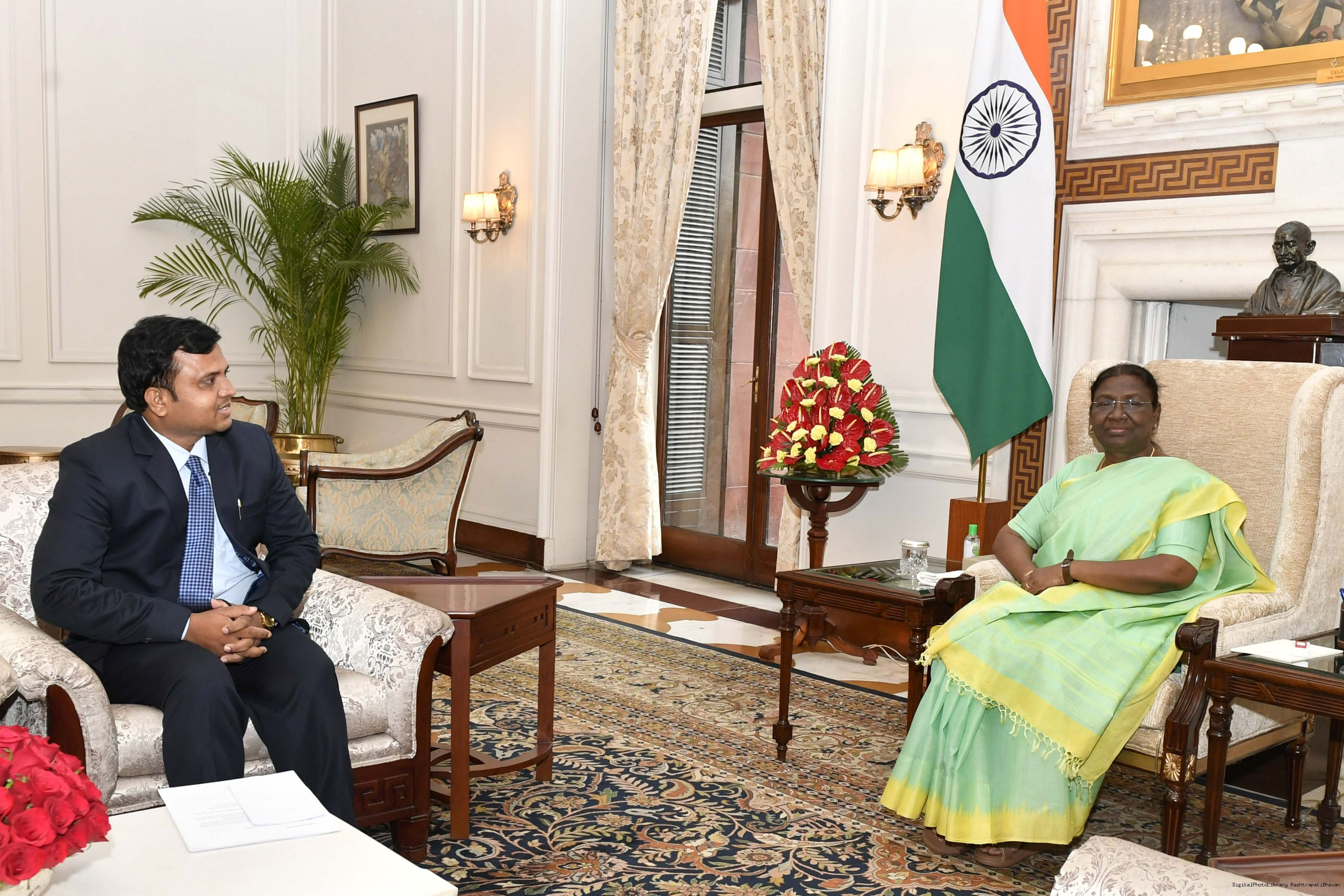 Shri V. Satish meeting with the President of India, Smt. Droupadi Murmu, at Rashtrapati Bhavan on Aug 03, 2022.
