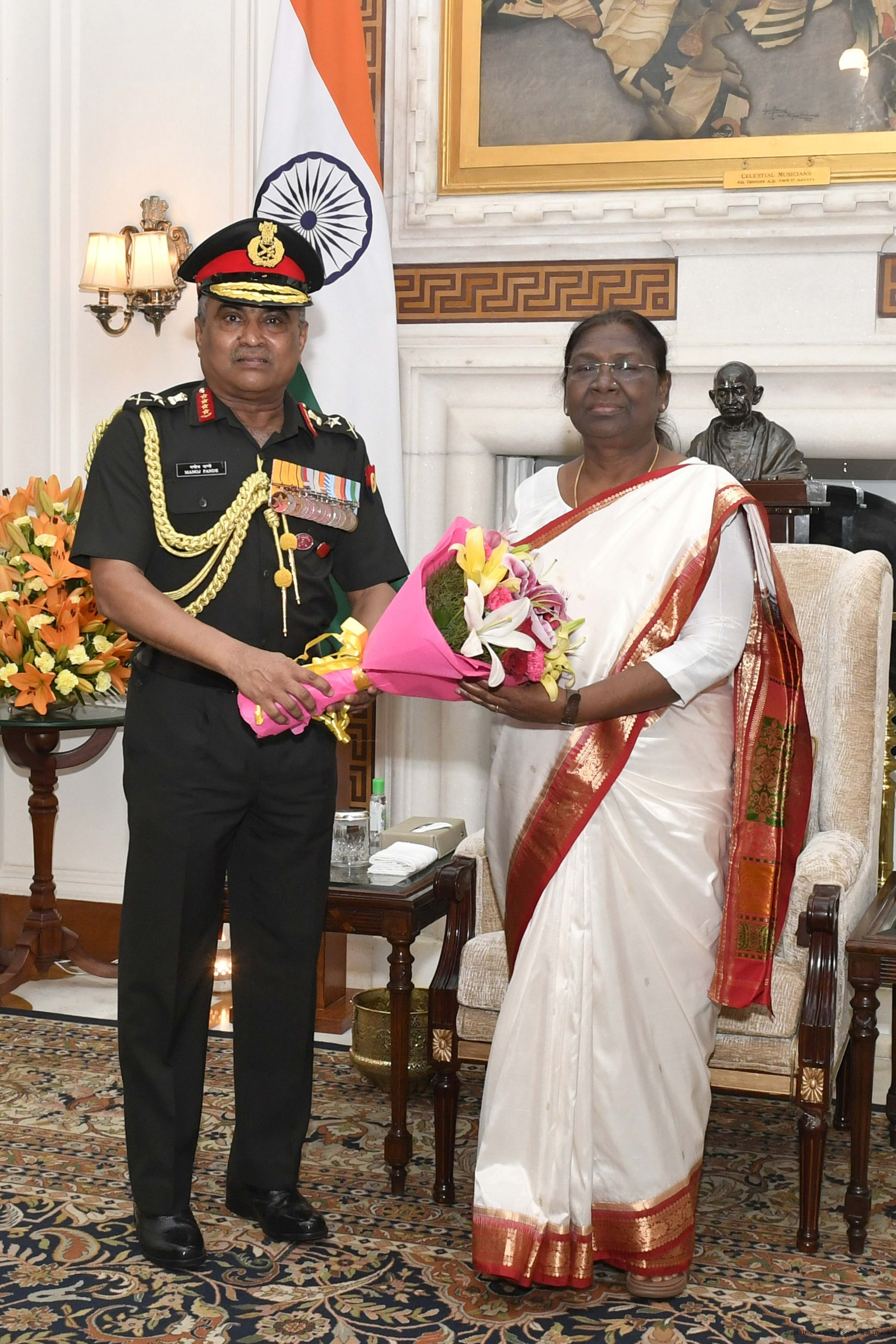 The Chief of the Army Staff, General Manoj Pande calling on the President of India, Smt. Droupadi Murmu, at Rashtrapati Bhavan on August 03, 2022.