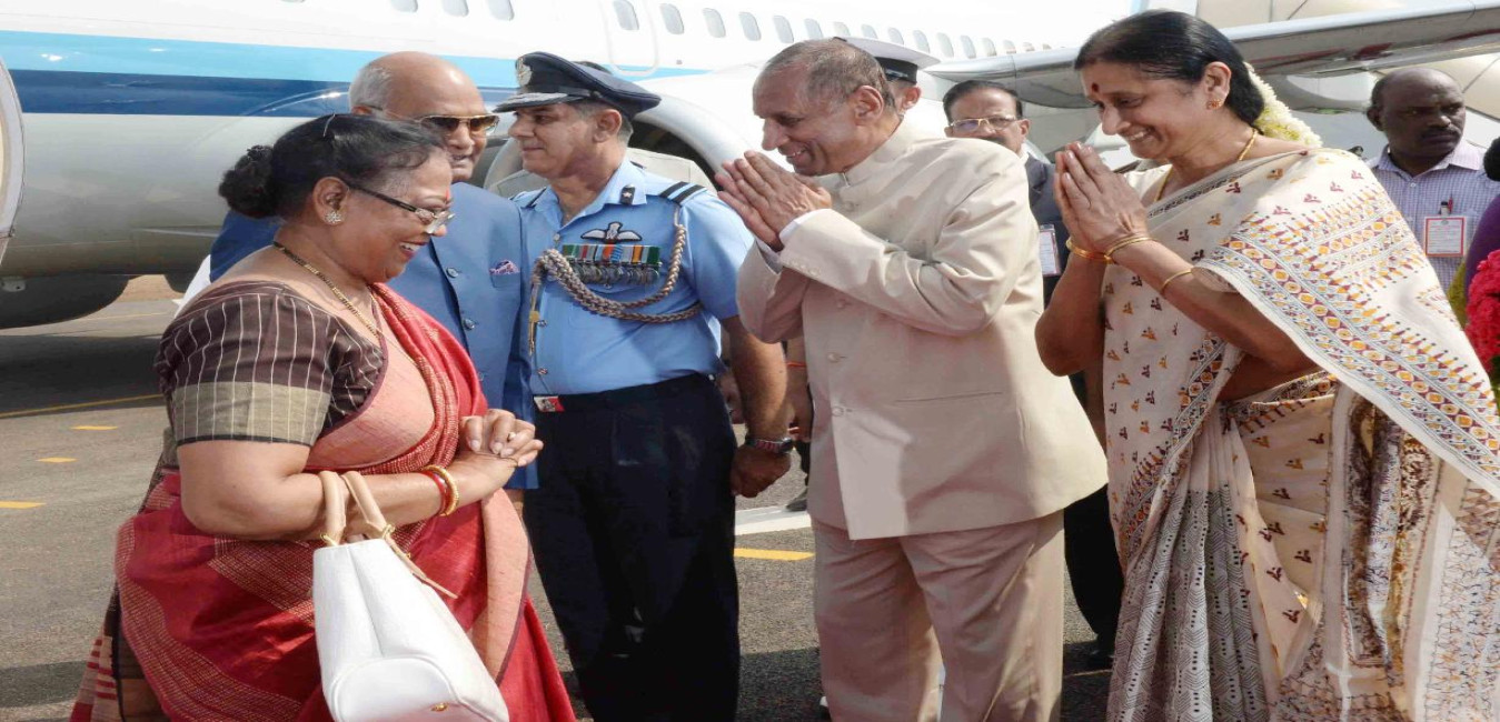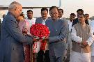 The President of India, Shri Ram Nath Kovind being received by the Governor of Andhra Pradesh and Telangana, Shri E.S.L. Narasimhan and the Chief Minister of Telangana, Shri K. Chandrasekhar Rao, on his arrival, at AFS Hakimpet, in Telangana on December 24, 2017.
