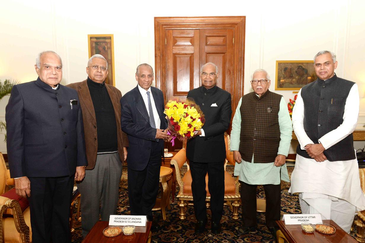 Shri E.S.L. Narasimhan, Governor of Andhra Pradesh & Telangana, Shri Banwarilal Purohit, Governor of Tamil Nadu, Shri Ram Naik, Governor of Uttar Pradesh, Acharya Devvrat, Governor of Himachal Pradesh and Shri Tathagata Roy, Governor of Tripura meeting with the President of India, Shri Ram Nath Kovind, at Rashtrapati Bhavan on December 11, 2017.