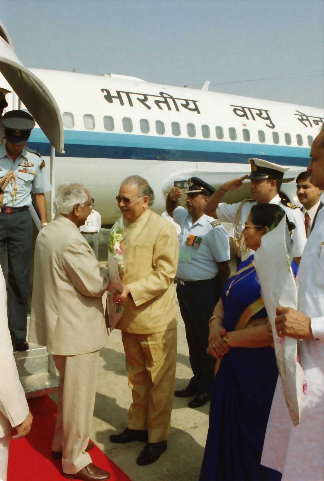 The President of India, Shri K R Narayanan being welcomed by the Governor of Rajasthan, Shri Anshuman Singh at Jaipur Airport in Rajasthan on Nov 06, 2001