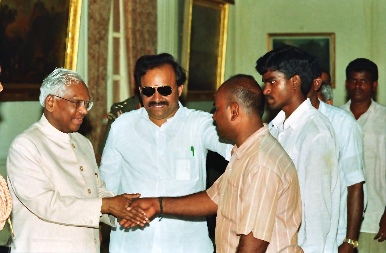 The President of India, Shri K R Narayanan meeting with the Delegation of Freedom Fighters from Krishnagiri Tamil Nadu along with others from his Constituency Shri C Narasimhan at the Yellow Drawing Room of Rashtrapati Bhavan in New Delhi on Aug 16, 1997