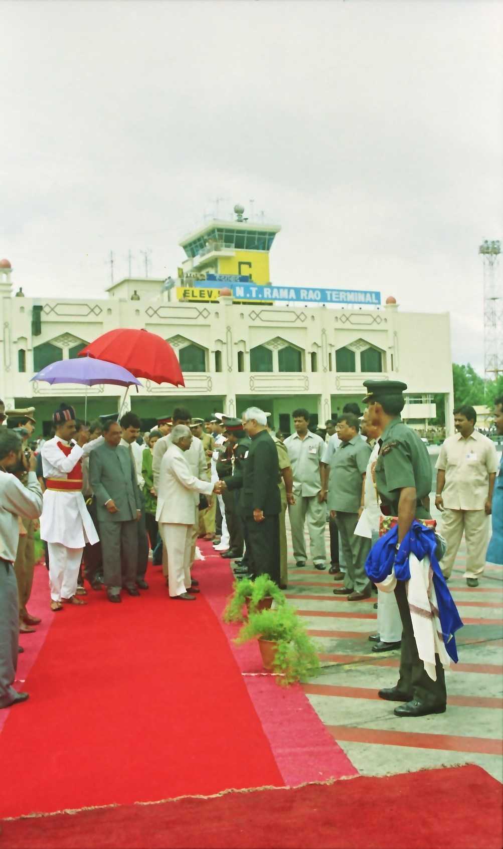 The President of India, Shri K R Narayanan being welcomed by the Governor of Andhra Pradesh, Shri C Rangarajan and the Chief Minister of Andhra Pradesh, Shri N Chandrababu Naidu at Hyderabad Airport in Andhra Pradesh on June 12, 1999