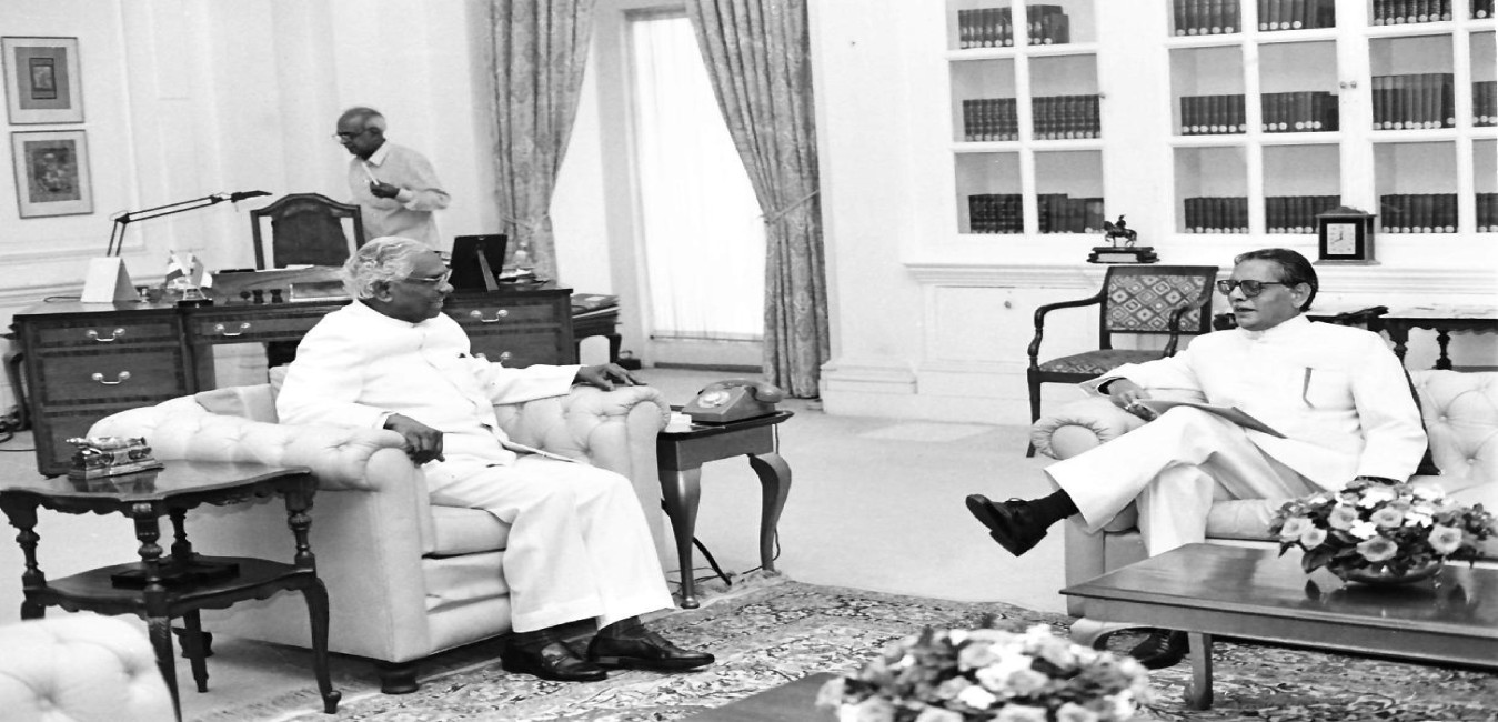 The President of India, Shri K R Narayanan meeting with the Former Prime Minister of India, Shri Chandra Shekhar at Rashtrapati Bhavan in New Delhi on Aug 06, 1997
