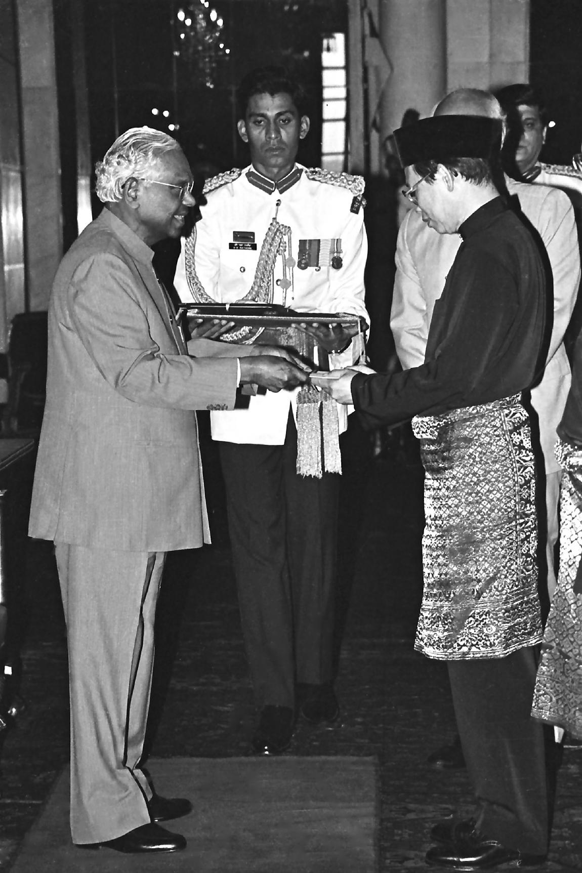 The High Commissioner-Designate of Malaysia to India, HE Mr Dato Choo Siew Kioh presenting his credentials to the President of India, Shri K R Narayanan at the Ashok Hall of Rashtrapati Bhavan in New Delhi on Sep 24, 1999