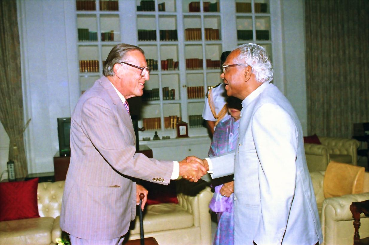 The High Commissioner of United Kingdom Countess Mountbatten, HE Mr David Gore Booth alongwith Lord Brabourne calling on the President of India, Shri K R Narayanan of Rashtrapati Bhavan in New Delhi on Aug 02, 1997