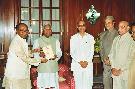 The President of India, Shri K R Narayanan during the Book Presentation a Copy of the Hindi Novel "Pehla Girmitya" by Shri Giriraj Kishore brought out by the Managing Trustee, Bharatiya Jnanpith Shri Ramesh Chandra at the Committee Room of Rashtrapati Bhavan in New Delhi on June 03, 1999