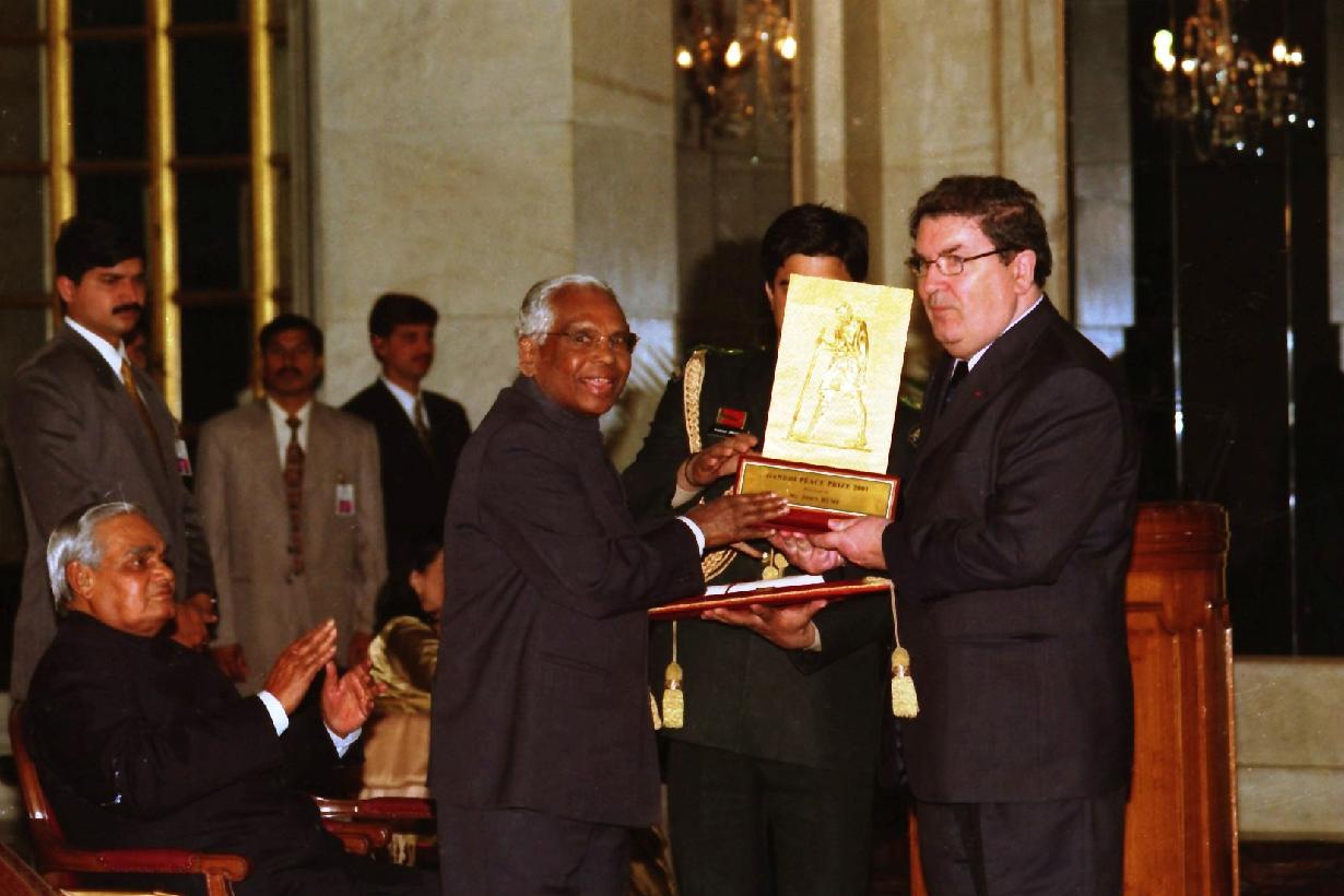 The President of India, Shri K R Narayanan presenting the Gandhi Peace Prize to Mr John Hume at the Ashok Hall of Rashtrapati Bhavan in New Delhi on Feb 01, 2002