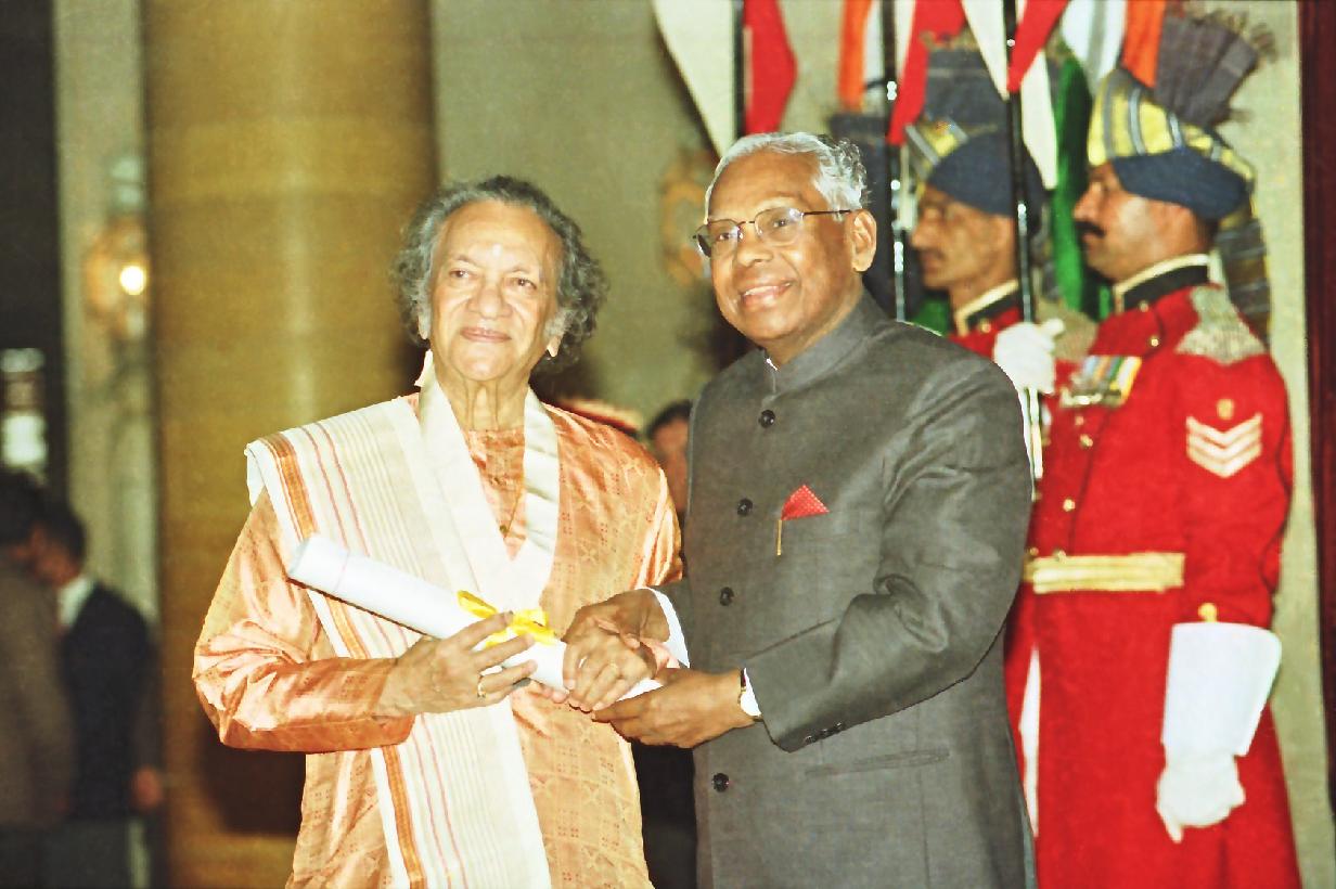 The President of India, Shri K R Narayanan presenting the Bharat Ratan Award to Pandit Ravi Shankar at the Darbar Hall of Rashtrapati Bhavan in New Delhi on Feb 16, 1999