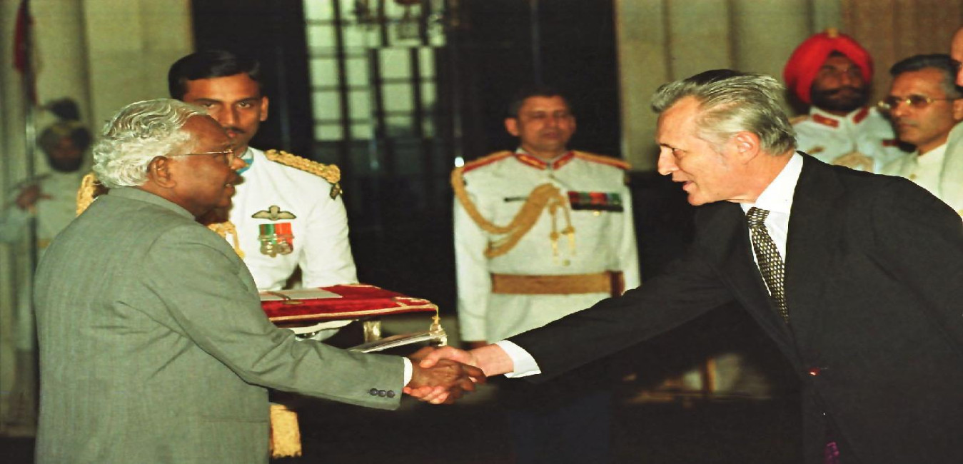The Ambassador-Designate of Romania to India, HE Mr Petre Mateescu presenting his credentials to the President of India, Shri K R Narayanan at the Ashok Hall of Rashtrapati Bhavan in New Delhi on Nov 10, 1997