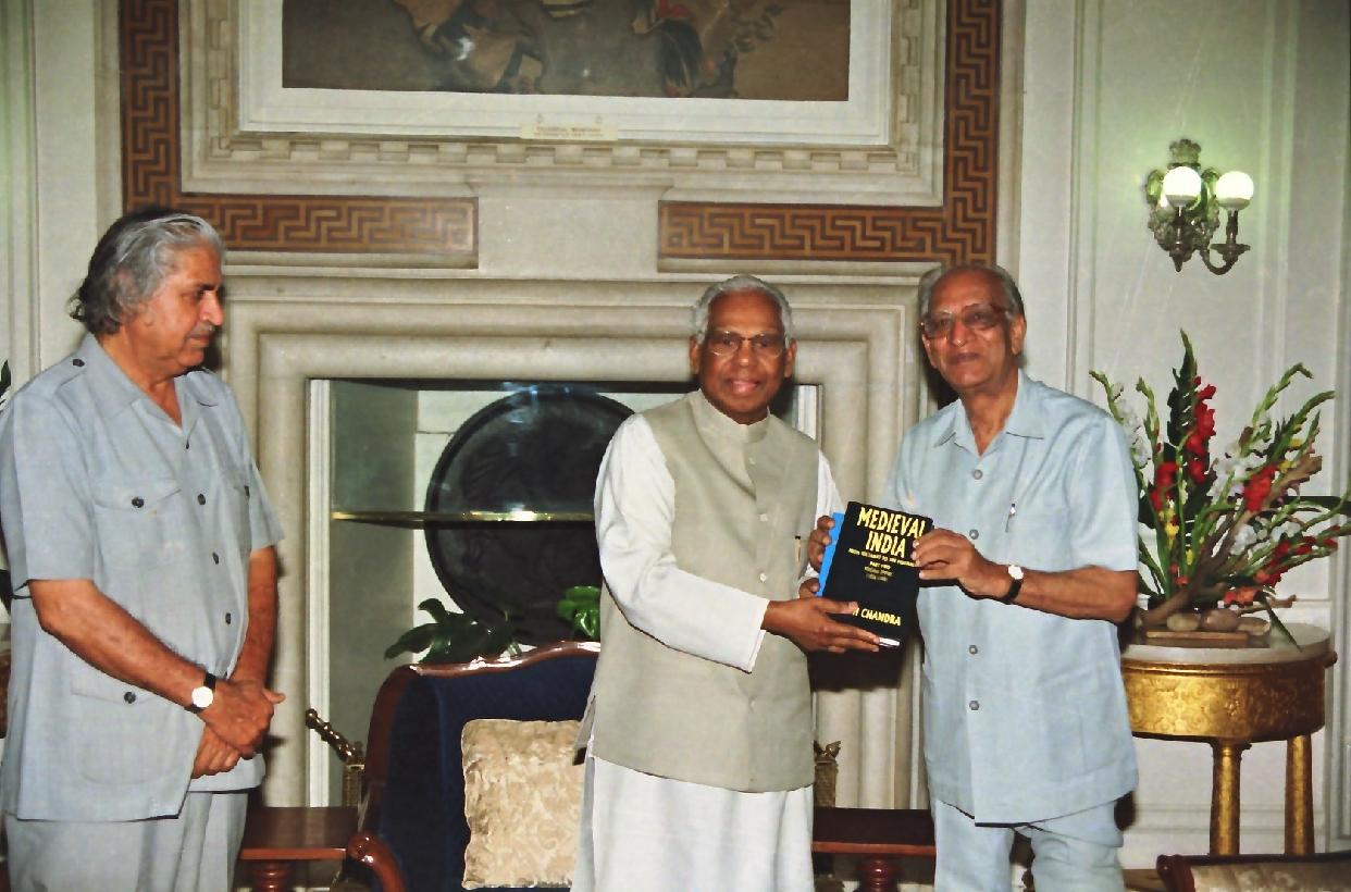The President of India, Shri K R Narayanan receiving a copy of the Book Mughal Empire in India from Prof Satish Chandra Member National Integration Council at the Morning Room of Rashtrapati Bhavan in New Delhi on Aug 23, 1999